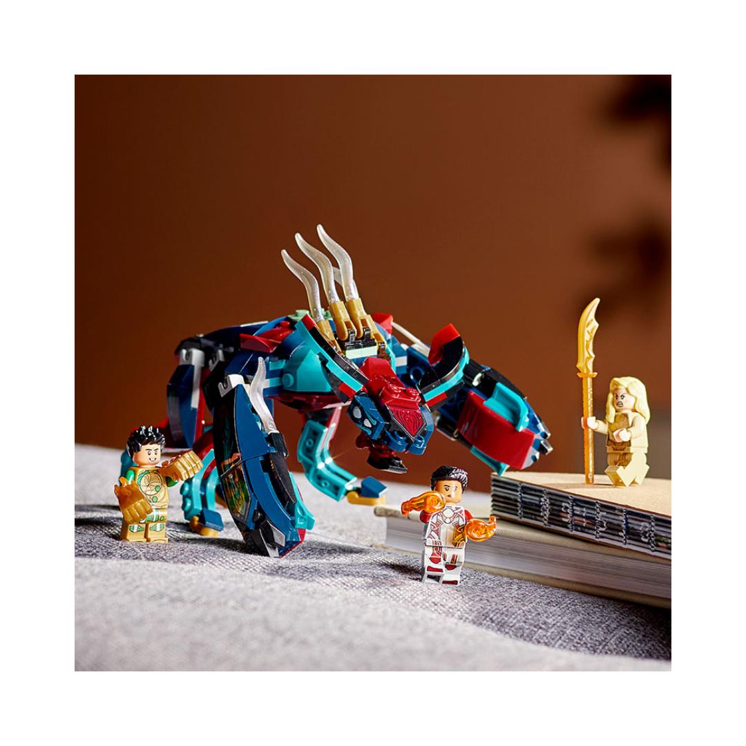 Inkluderer tre LEGO Marvel Eternals superhelt-minifigurer – Thena, Makkari og eksklusive Gilgamesh – en bevegelig, seksbeint Deviant med munn som kan åpnes og lukkes, dolk, våpenhanske og skyter.