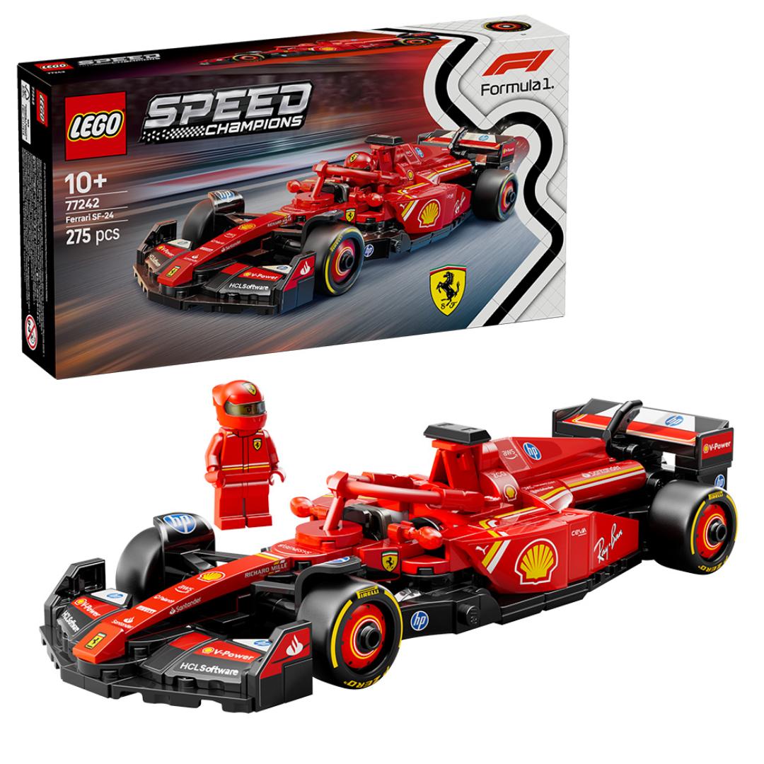 LEGO Speed Champions Ferrari SF-24 (77242) lar byggere fra 10 år oppleve F1-stemningen hjemme. Modellen gjenspeiler 2024-bilens linjer med cockpit som åpnes via bøyle, bakvinge, triangelstagoppheng og bredere bakdekk med «Pirelli»-trykk.