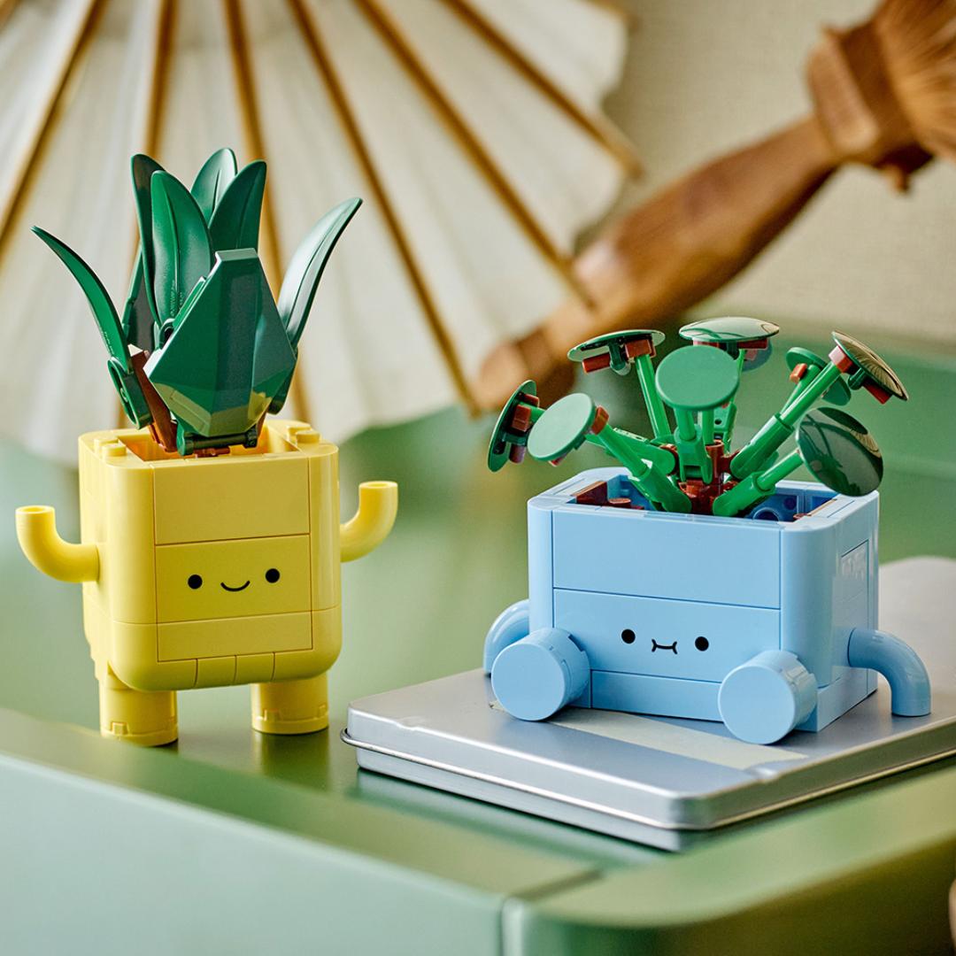 LEGO Blomster 10349 Glade planter (Botanical Collection) sprer godt humør for byggere fra ni år. Inneholder to søte plantemodeller – en stående dracaena og en sittende pilea – samt to potter (blå og gul) med smilende tegneseriefjes. Plantene kan bytte potter og stilles ut sammen eller hver for seg.