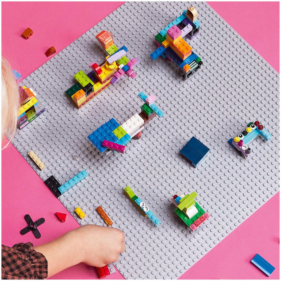 Med LEGO Classic Grå basisplate (11024) får barn en setting hvor de kan utfolde seg fritt. Den grå basisplaten måler 38 x 38 cm og gir barn et romslig 48 x 48-knotters LEGO landskap, hvor de kan bygge, leke og vise fram modellene sine. Gi LEGO byggere utallige byggemuligheter, fra gatescenarioer og slott til fjellandskap. Basisplaten gir utrolig bra feste for alle slags LEGO byggeklosser, slik at barn kan bygge akkurat slik de vil, til og med opp ned! Og når byggingen er ferdig, kan barn frakte og stille ut modellene sine på platen uten å være redd for at de skal gå i stykker. Med LEGO Classic settene får barn muligheten til å uttrykke seg og leke fritt. Og underveis mens de bygger, skaper og bruker fantasien, blir de stadig flinkere til å tenke utenfor boksen og løse problemer!