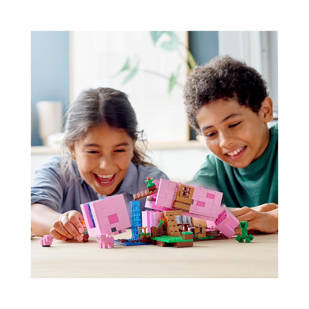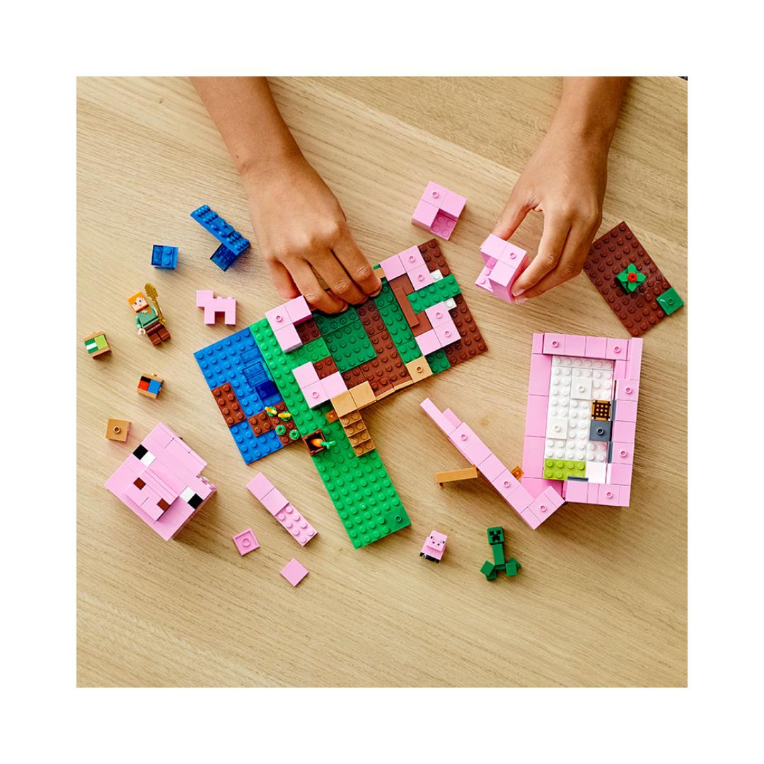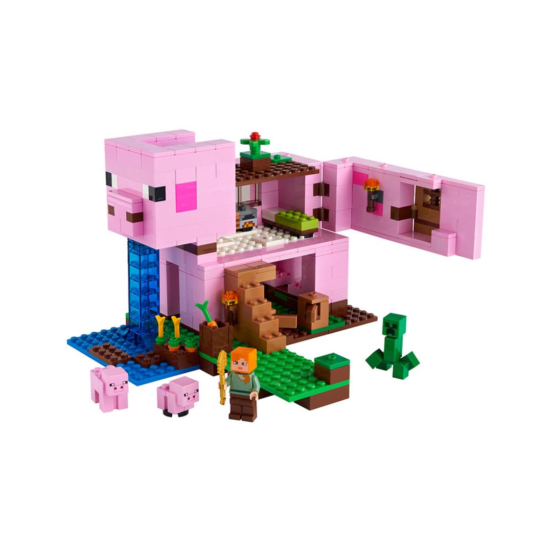 Barn kan bruke Minecraft ferdighetene sine til å bygge en modell som er like kreativ som i det digitale spillet – et hus formet som en kjempegris! Den ene siden kan åpnes inn til et stort rom, mens det avtakbare taket gir tilgang til enda flere lekemuligheter. Modellen kan endres i det uendelige, og hele hodet kan tas av og plasseres andre steder på modellen. Spillets dristige helt Alex, er klar for lek og moro, mens en ikonisk Creeper lusker rundt og prøver å ta spillerne i et bakholdsangrep. Med to søte griser å passe på er det mer enn nok å ta seg til utendørs også. I tillegg har settet en eksplosjonsfunksjon i ekte Minecraft stil, som sprenger leken i fillebiter!