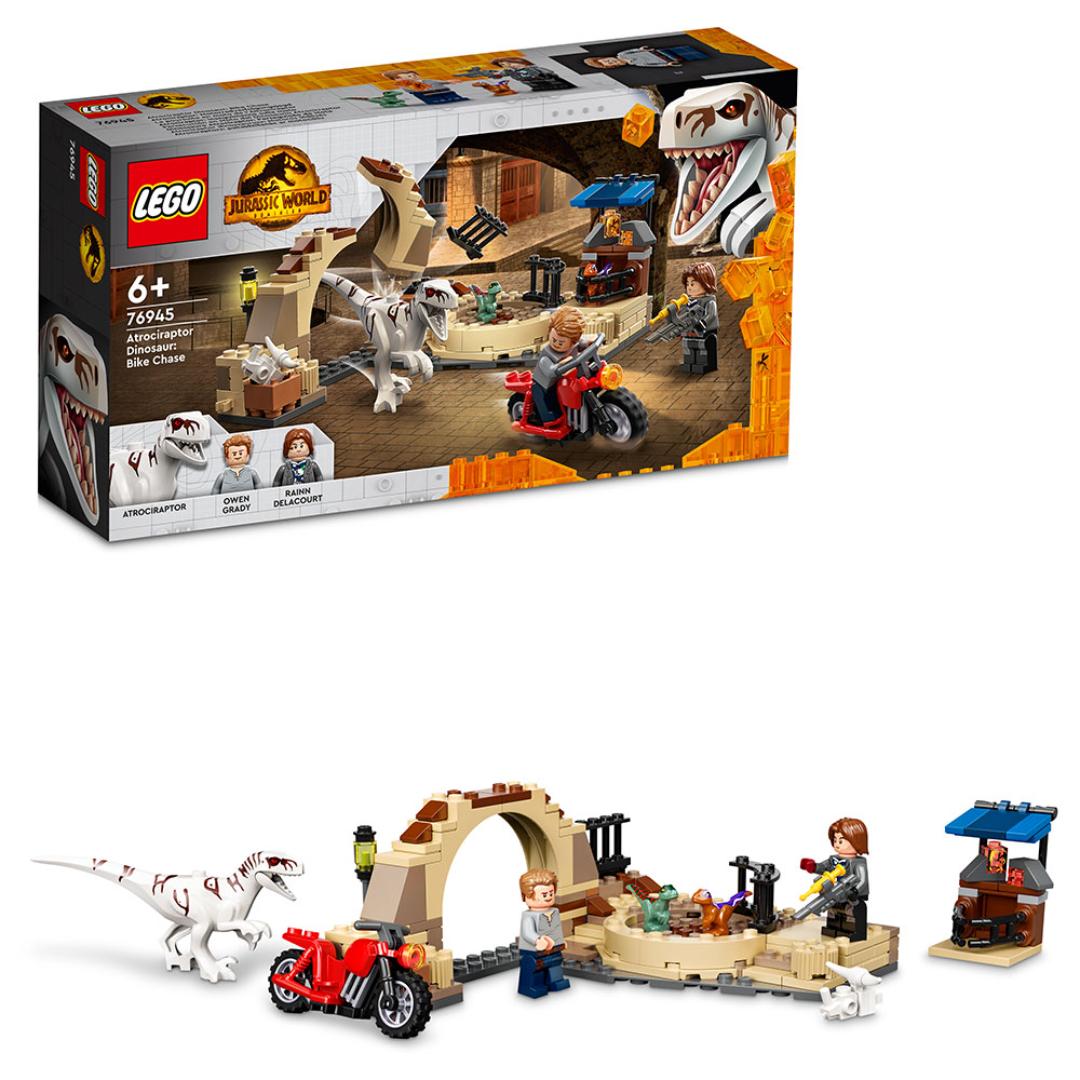 Fans kan gjenskape spennende scener fra filmen Jurassic World Dominion med byggesettet Motorsykkeljakt på Atrociraptor (76945). Settet er perfekt som gave til barn fra seks år og oppover, som fortjener en belønning, og inkluderer en bevegelig atrociraptor-figur, motorsykkel og et klossebygd marked med en veltbar vegg og roterende dinosaur-kamparena.