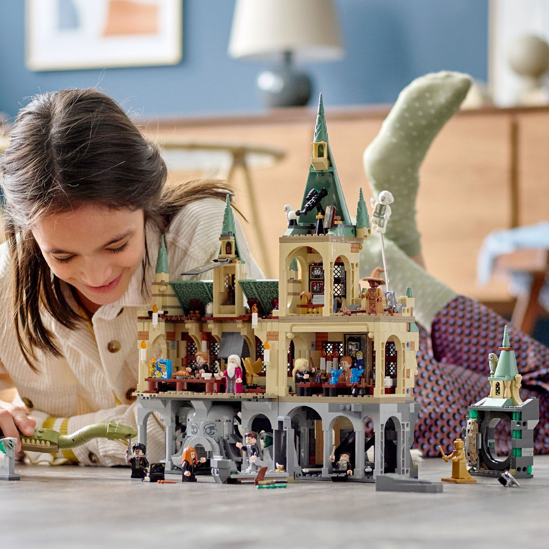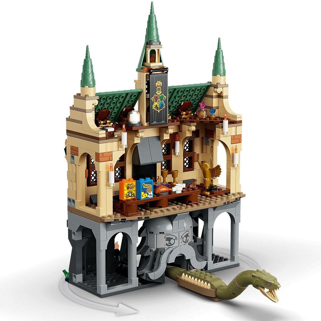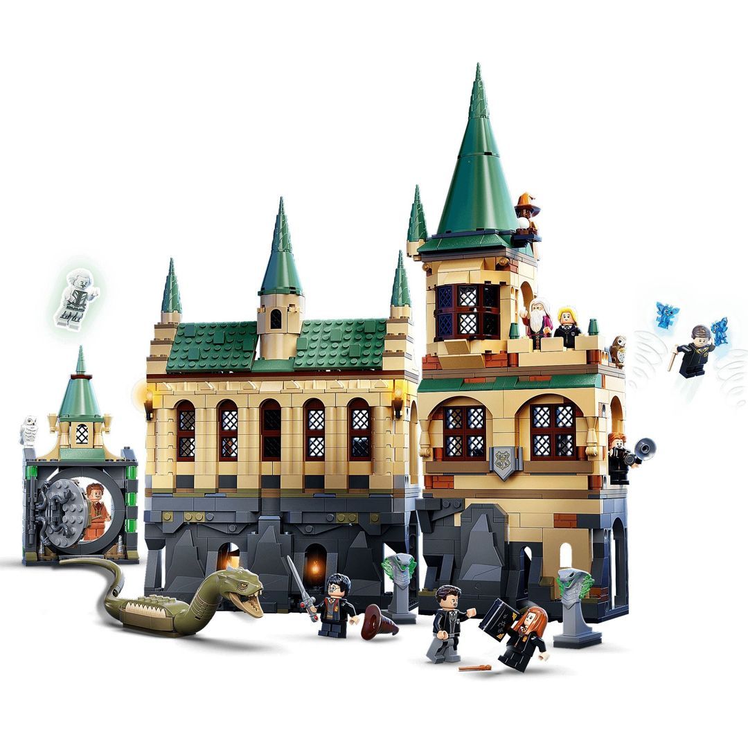 Dette allsidige settet inkluderer berømte rom, fortryllende funksjoner og kjente karakterer fra filmene om Harry Potter. Festsalen rommer to langbord, Humlesnurrs talerstol med gullugledekor og autentisk tilbehør som valghatten. Som i filmene har Mysteriekammeret den velkjente, sirkelrunde døren og en stor statue med en munn som kan åpnes og fører inn til en gang som basilisken bruker for å komme inn i rommet. Ti minifigurer byr på fantasifulle leke- og utstillingsmuligheter: Harry Potter, Gulla Wiltersen, Tom Dredolo Venster, Frodrik Fromm, Julius Finkenfjær, Lulla Lunekjær, Gyldenprinz Gulmedal, Albus Humlesnurr, professor Schkummel og Nesten hodeløse Nikk. Settet inkluderer også noen ekstra godbiter: en eksklusiv, gullfarget jubileumsminifigur av Voldemort og seks tilfeldige trollmannkort-fliser.