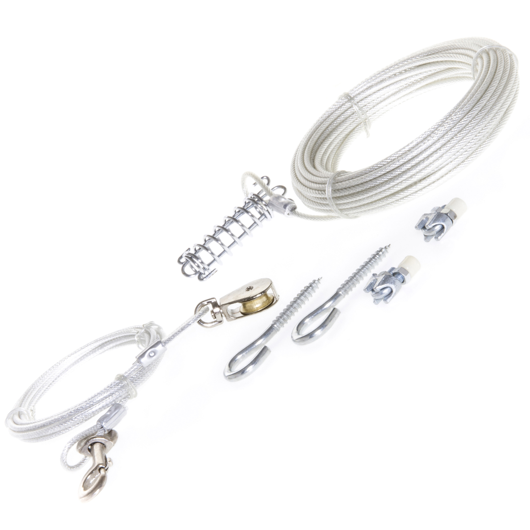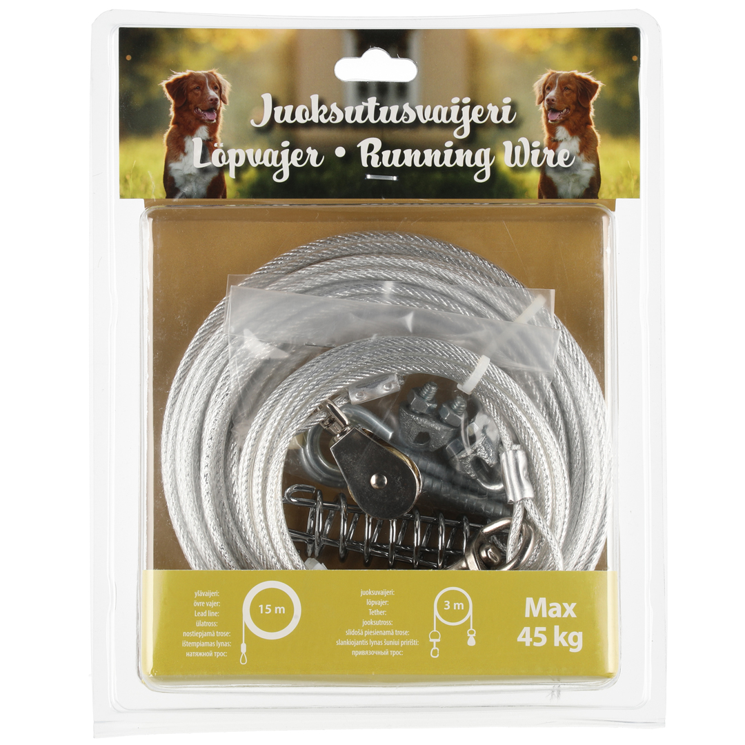 Lengde på løpekabel (horistontal): 15 meter. Lengde på vertikal kapel 3 meter. Maks vekt på hund: 45 Kg.