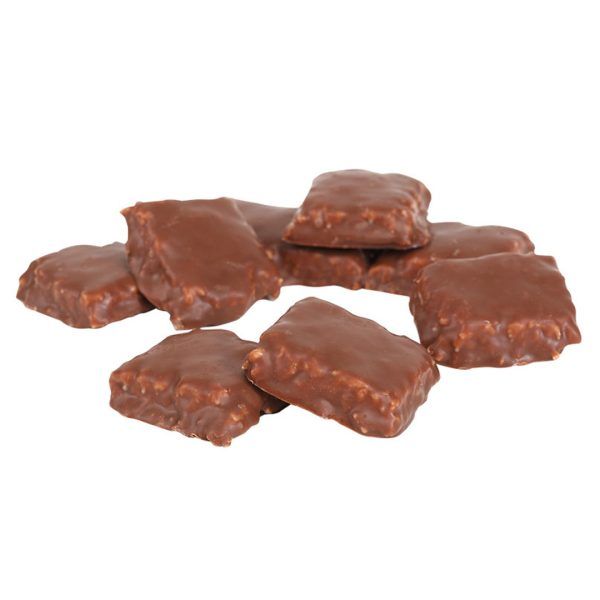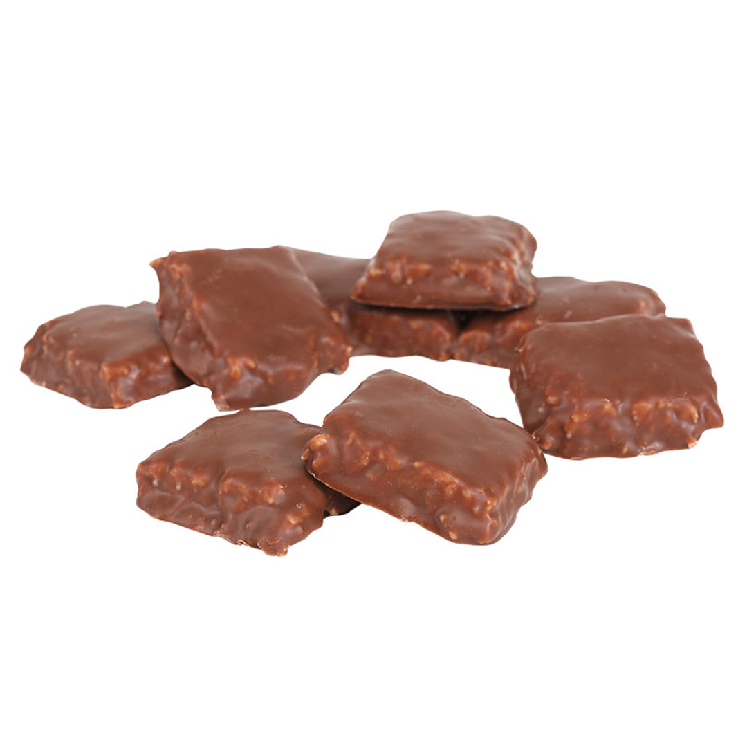 Ingredienser: Sukker, glukosesirup, kokosflak, vegetabilsk fett (palme, shea), kakaosmør, TØRRMELK, kakaomasse, emulgator (SOYAlecitin, E476), salt, aroma (vanillin).