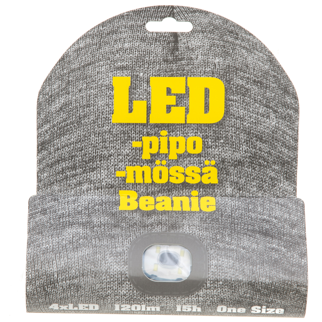 Lue med 4 x LED lys. 120 Lumen. 3 lysnivåer. Drives av 2 x C R2032batterier (inkludert). Produsert av 65% polyester og 3 5 % akryl. Ledlys er avtagbart og luen kan vaskes på 30 gra der.