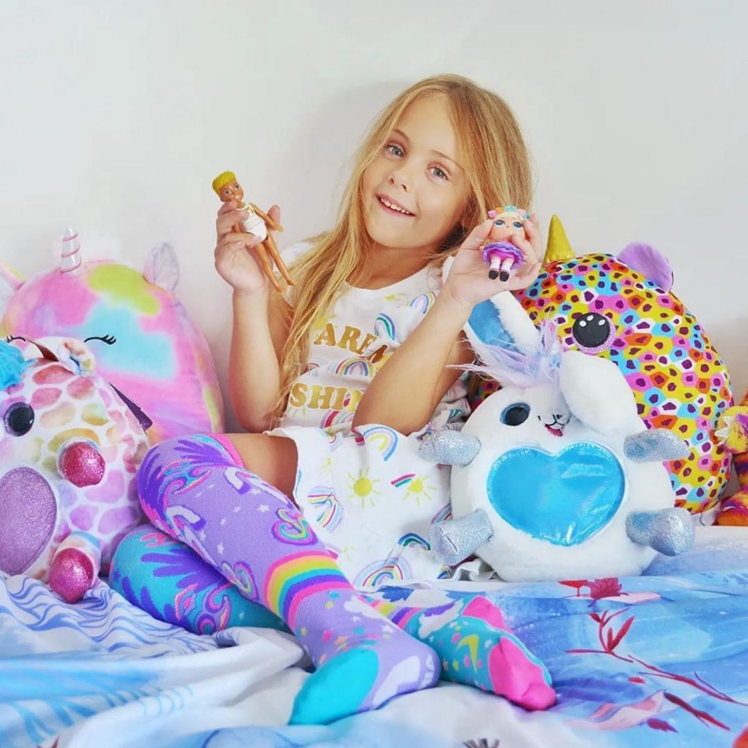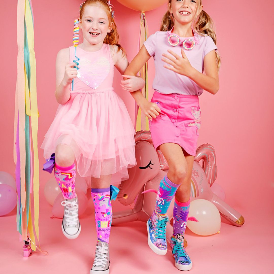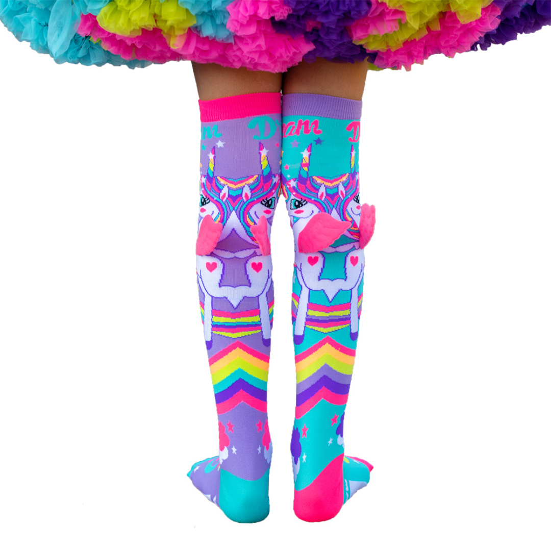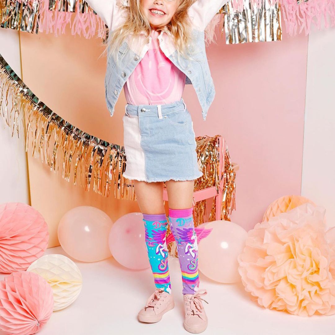 Madmia Mini Pony Socks har et fargerikt motiv med enhjørningstema og små rosa vinger som gir et lekent uttrykk. Sokkene er laget i myke og holdbare materialer og passer godt til barn som vil ha et ekstra sprekt tilbehør. One size-modell for barn fra 6 år.