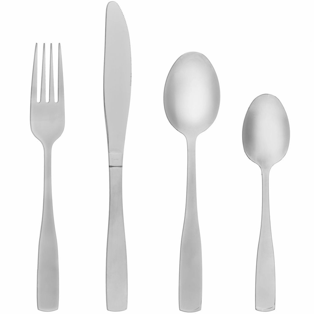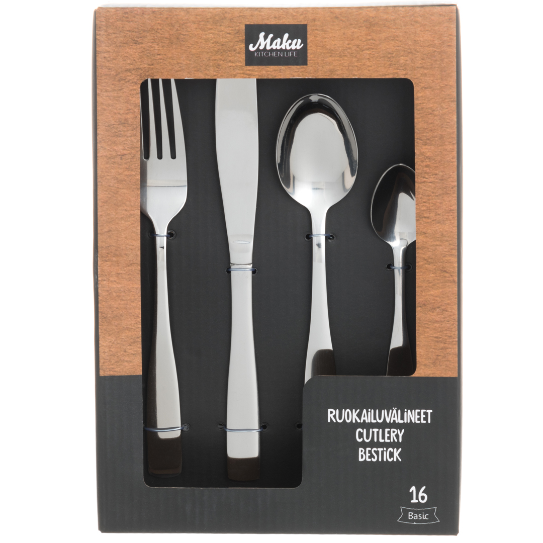 16 delers bestikksett fra Maku. Inneholder: 4 stk gafler, 4 stk kniver,4 stk skjeer og 4 stk teskjer. Rustfritt stål og kan vaskes i maskin.