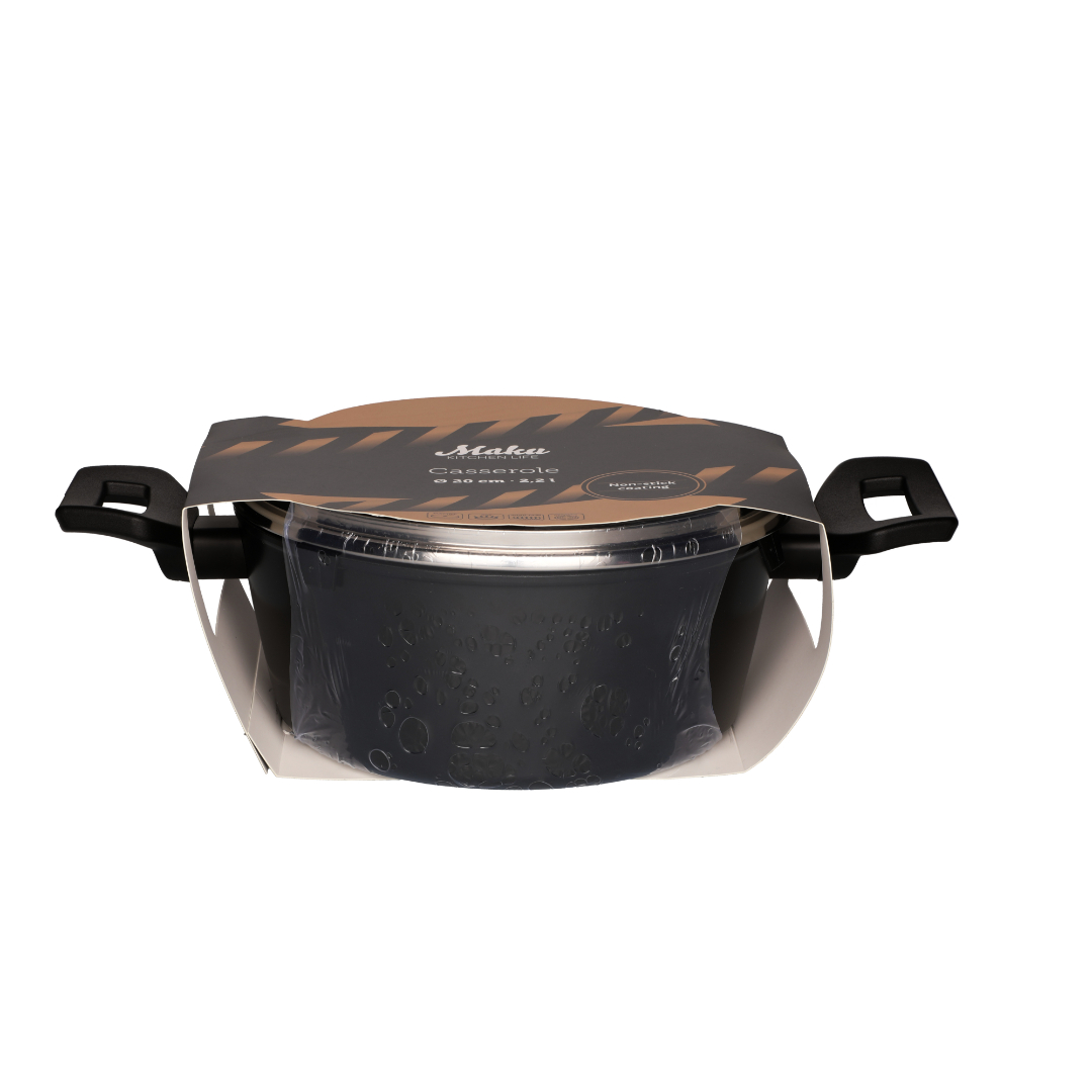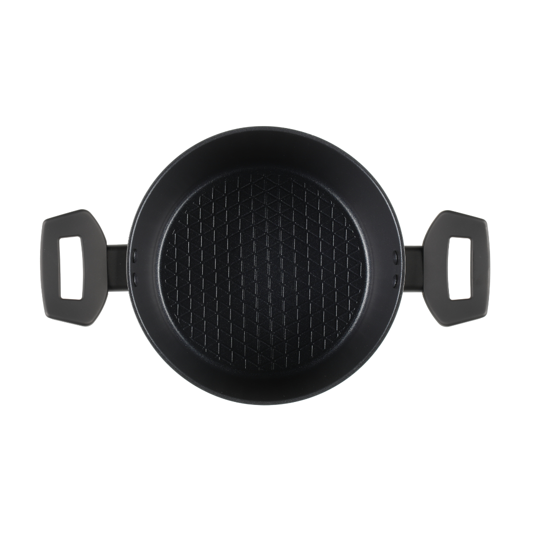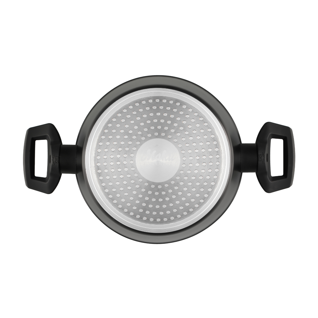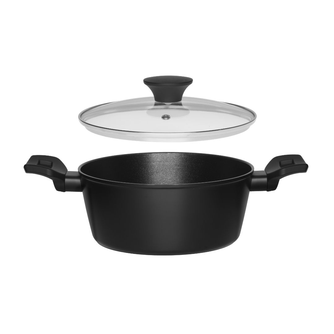 Lett og brukervennlig gryte i smidd aluminium med non-stick belegg og bunn i rustfritt stål. Varmebestandige, romslige bakelitthåndtak. Glasslokk med dampventil. Passer alle komfyrtyper. Tåler oppvaskmaskin (håndvask anbefales).