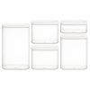 Sett med fem transparente oppbevaringsbokser i holdbar plast. Perfekt til organisering av tørrvarer som pasta, mel, ris og frokostblanding. Lokket sørger for god forsegling og oversiktlig oppbevaring. Kun håndvask.