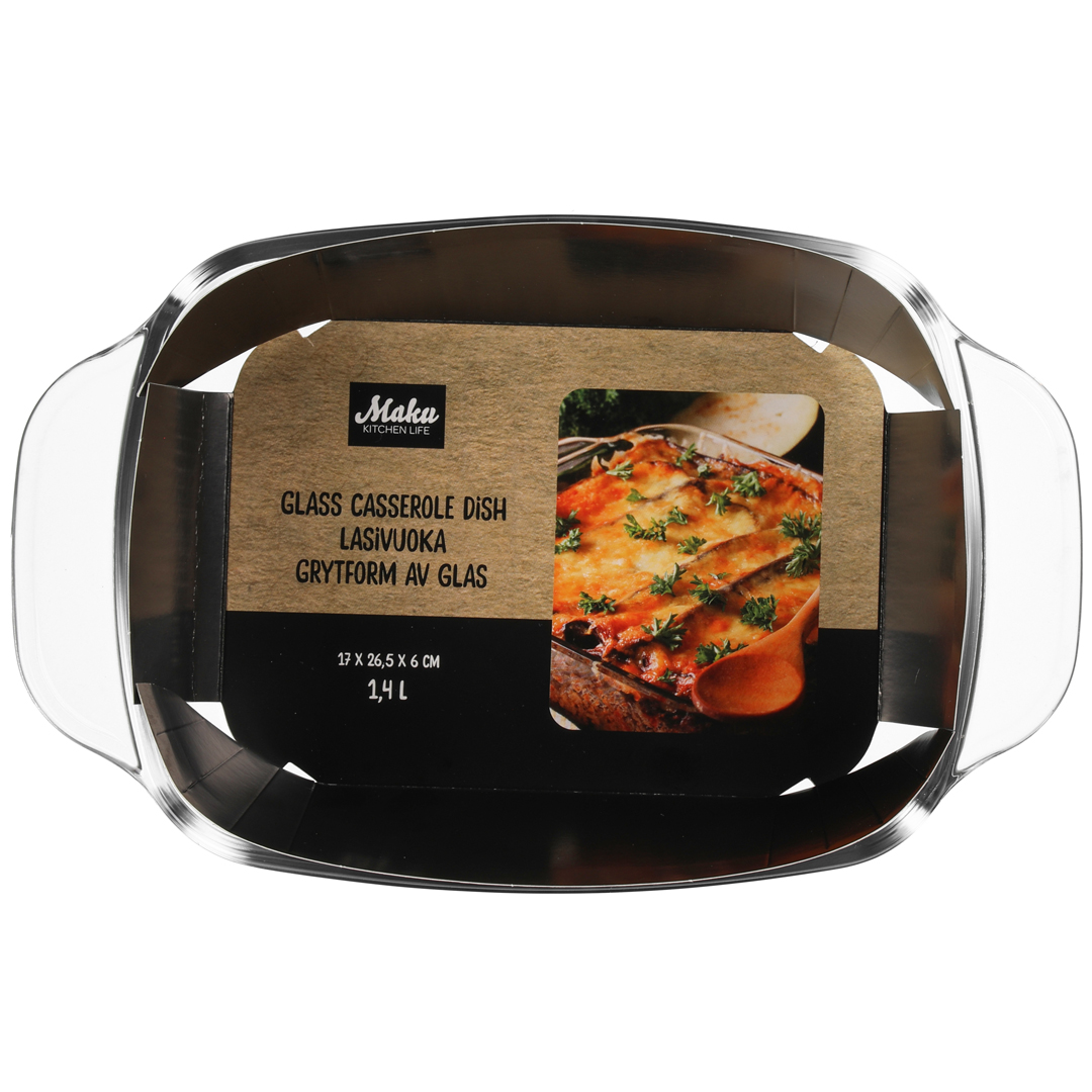 Maku ildfast form, tåler temperaturer fra -50 til +500 grader celsius. Kan vaskes i oppvaskmaskin. Mål: 27 x 17,3 x 6 cm. Volum: 1,4 liter.