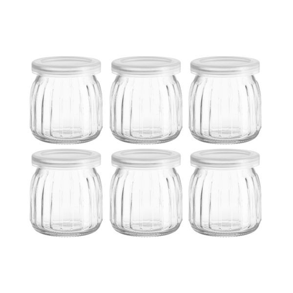 Sett med seks små glasskrukker med plastlokk. Perfekte til krydder, syltetøy eller små porsjoner. Kapasitet 180 ml per glass. Krukkene tåler oppvaskmaskin.