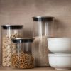 Organiser kjøkkenkaos med stilige Maku Kitchen lives oppbevaringskrukker. Bruk glassene til å organisere tørr mat som pasta, ris, mel og frokostblandinger. Enkelt å se hva som er i glasset og om du trenger å fylle på. Dekorativ oppbevaringskrukke med tettsittende lokk i metall med silikonring. Glasskrukke tåler oppvaskmaskin, håndvask med lokk. Mål: ќ10,5 cm Høyde: 18,5 cm.