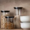 Organiser kjøkkenkaos med stilige Maku Kitchen lives oppbevaringskrukker. Bruk glassene til å organisere tørr mat som pasta, ris, mel og frokostblandinger. Enkelt å se hva som er i glasset og om du trenger å fylle på. Dekorativ oppbevaringskrukke med tettsittende lokk i metall med silikonring. Glasskrukke tåler oppvaskmaskin, håndvask med lokk. Mål: ќ10,5 cm Høyde: 12,5 cm.