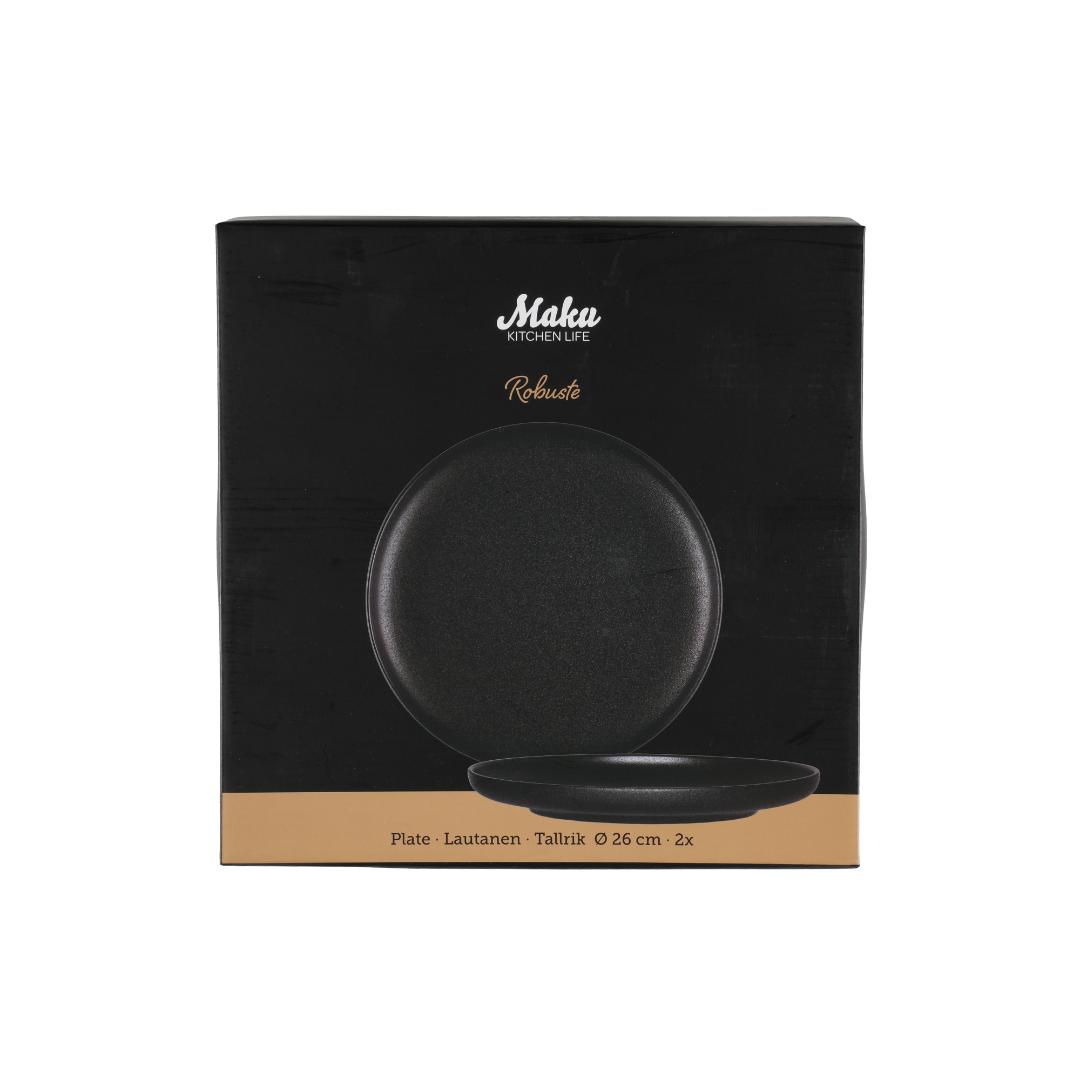 Maku Kitchen Life Robuste tallerken 26 cm 2-pk er middagstallerkener i steintøy med en overflate som minner om støpejern. Den dype, sorte fargen gir et markert uttrykk på bordet og fremhever maten på en fin måte. Tallerkenene passer like godt til hverdags som til selskapsbruk, og kan brukes i ovn, mikrobølgeovn, fryser og oppvaskmaskin.