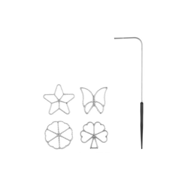 Rosettjern med fire utskiftbare former: blomst, sommerfugl, stjerne og kløver. Håndvask. Typisk materiale: støpt aluminium med håndtak.