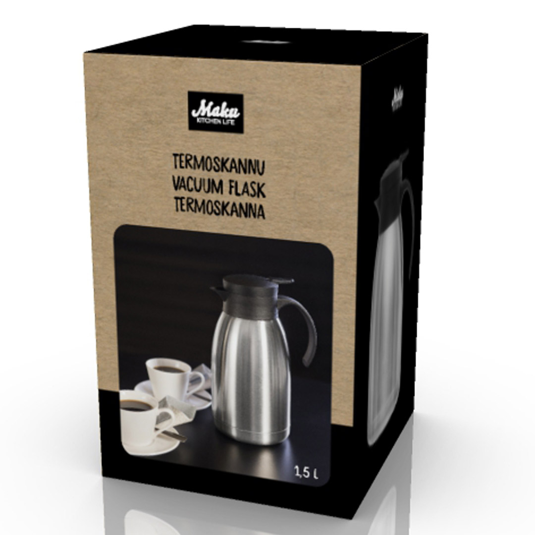 Stilig 1,5 liters termos i stål holder drikker varme eller kalde i lang tid. Lokket betjenes med en trykknapp. Holder kokende drikke 80 grader i opptil 6 timer, 60 grader i 12 timer og 40 grader i 24 timer. Håndvask.