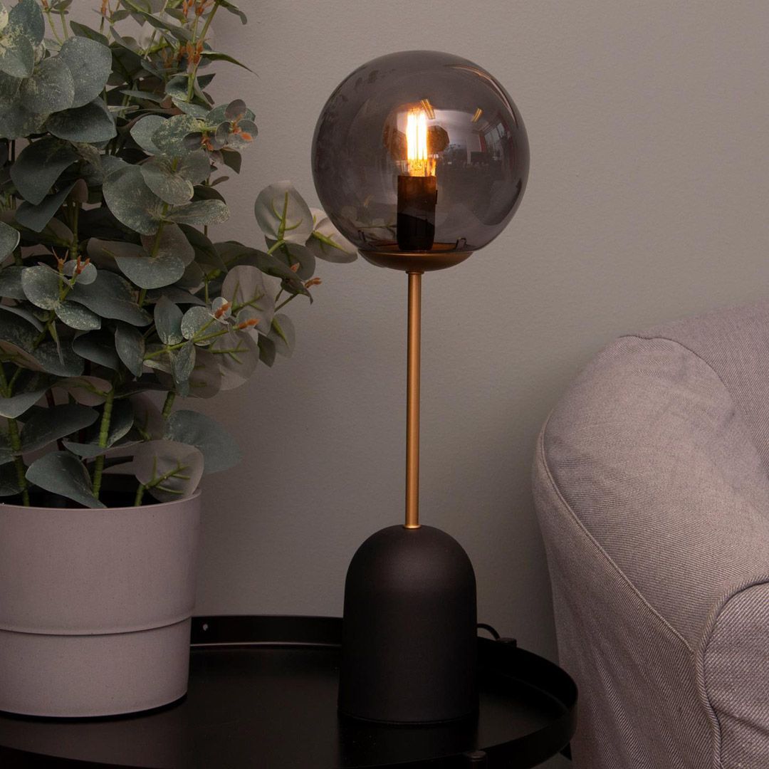 Mayari bordlampe med sotet glasskjerm. Diameter: 15 cm. Høyde: 46 cm. Lengde: Ledningens lengde er 150 cm. Materiale: Metall og glass. Lyskilde: Medfølger ikke. Lysregulering: Bryter på ledning. Maks effekt: 15W. Sokkel: E14. Klasse: KL. II. Spenning: 220-240V. IP klasse: IP20. CE merket: Ja.