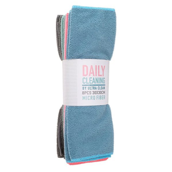 Pakke med 8 stk microfiberkluter. Mål: 30 x 30 cm.