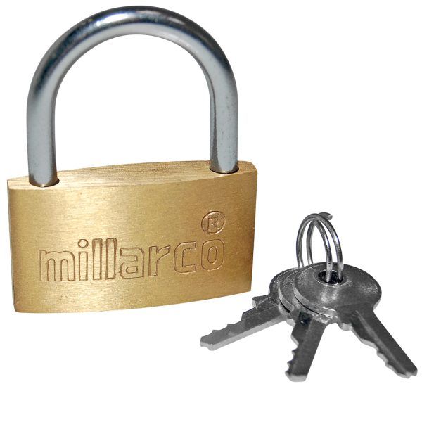 Hengelås i messing. Mål: 40 mm. Inkl. 3 nøkler. Nøklekombinasjoner: 256. Bredde: 40 mm. Høyde på bøylen: 25 mm. Innvendig bøyle mål: 22 mm. Tykkelse på bøylen: ќ 4,5 mm. Høyde på huset: 22 mm. Bruk: Meget godt egnet til avlåsing av loft- og kjellerrom, redskapsboder m. M.