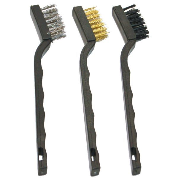 Sett med tre ministålbørster fra Millarco, designet for presisjonsarbeid på små og vanskelig tilgjengelige områder. Inneholder børster med stål-, messing- og nylonbust, egnet for ulike rengjørings- og overflatebehandlingsoppgaver.