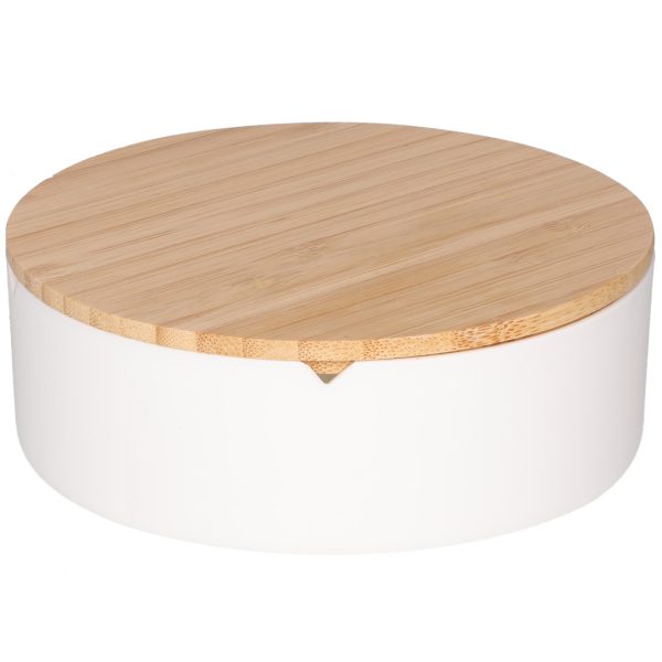 Mineas rund oppbevaringsboks med bambus lokk. Mål: ќ14 cm. Høyde 5 cm.