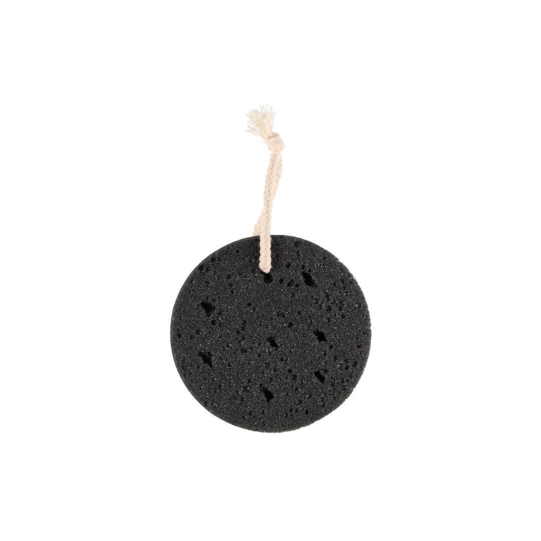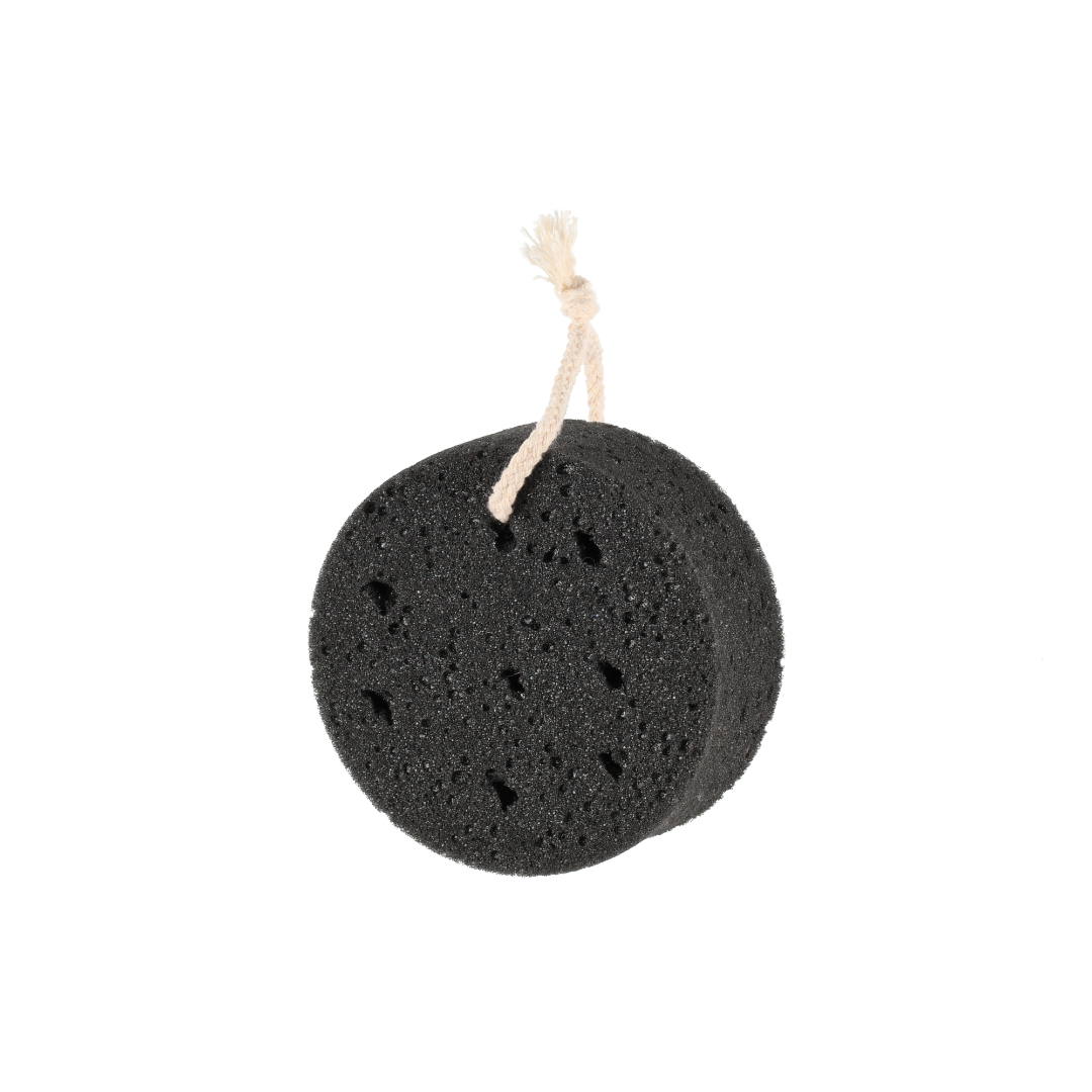 Rund dusjsvamp i sort farge med hempe for oppheng. Gir godt skum og passer til daglig vask av hele kroppen.