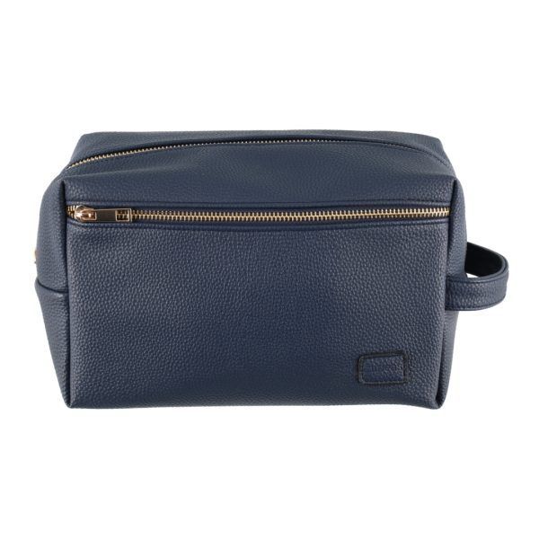 Kosmetikkveske i mørkeblå imitert skinn med glidelås. Passer til toalettsaker hjemme, på jobb eller på reise.