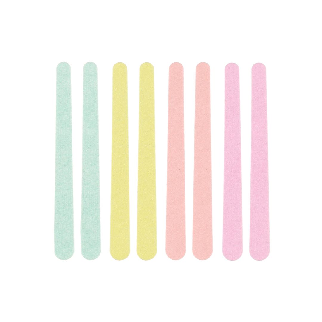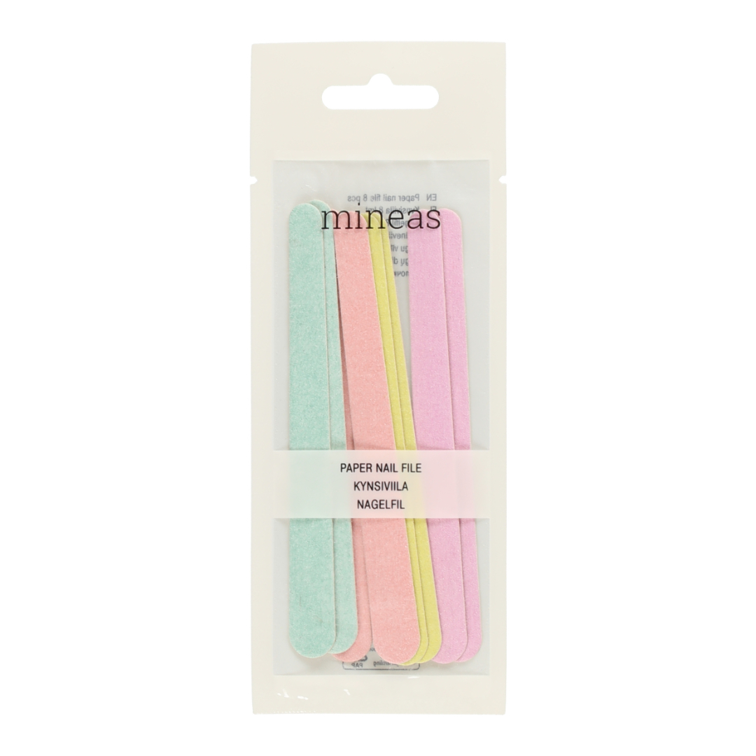 Sett med åtte neglefiler i papir som former og jevner neglene. Leveres i ulike pastellfarger.