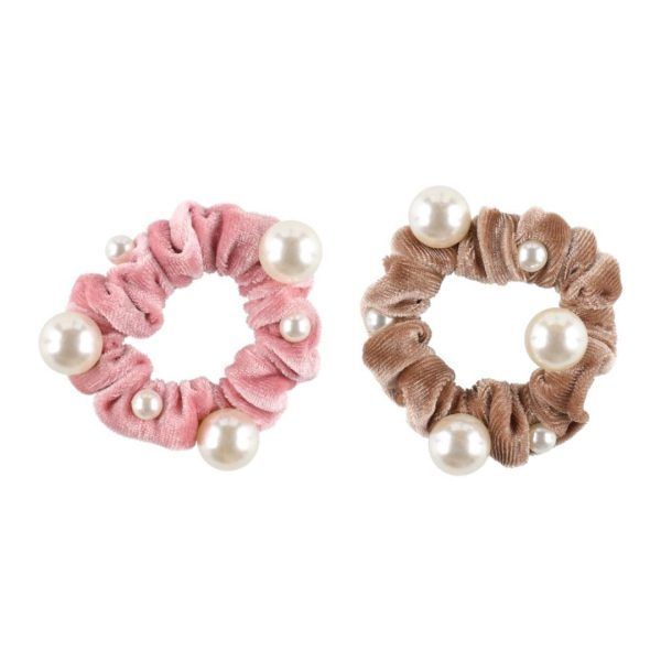 Sett med to små scrunchies i myk velur, dekorert med perler. Pakken inneholder én rosa og én beige strikk, perfekte for å gi frisyren et delikat og elegant uttrykk. Passer både til hverdag og fest.