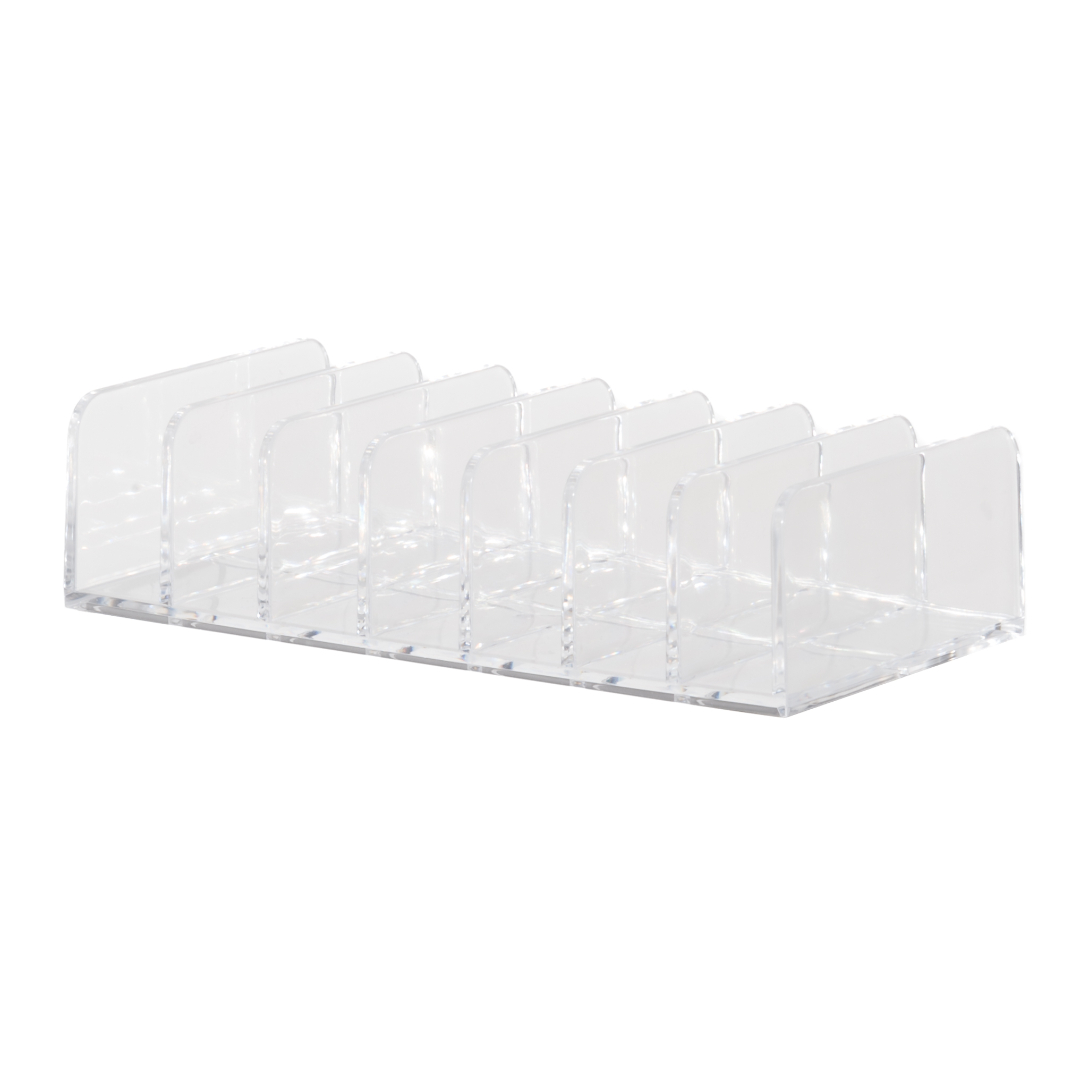 Kompakt holder for å organisere sminkepaletter. Gir plass til sju paletter og holder bord og skuffer ryddige. Laget i klar plast.