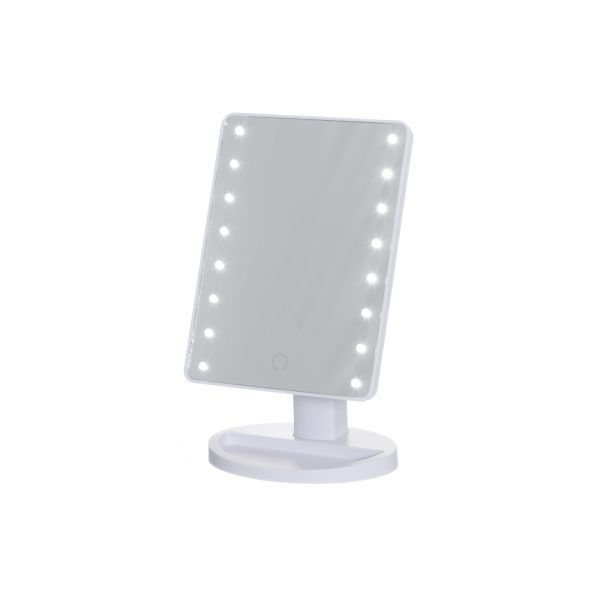 Mineas make up-speil med LED-lys i hvit utførelse er et sammenleggbart sminkespeil med 24 dimbare LED-lys som gir god belysning under sminking. Speilet kan vinkles etter behov, og sidepanelene har 2x og 3x forstørrelse for presis detaljarbeid. Det betjenes med en berøringsknapp, og basen har åpen oppbevaringsplass for småting. Speilet måler 18 × 12 × 29 cm og kan brukes med USB-kabel (inkludert) eller fire AA-batterier, som kjøpes separat.