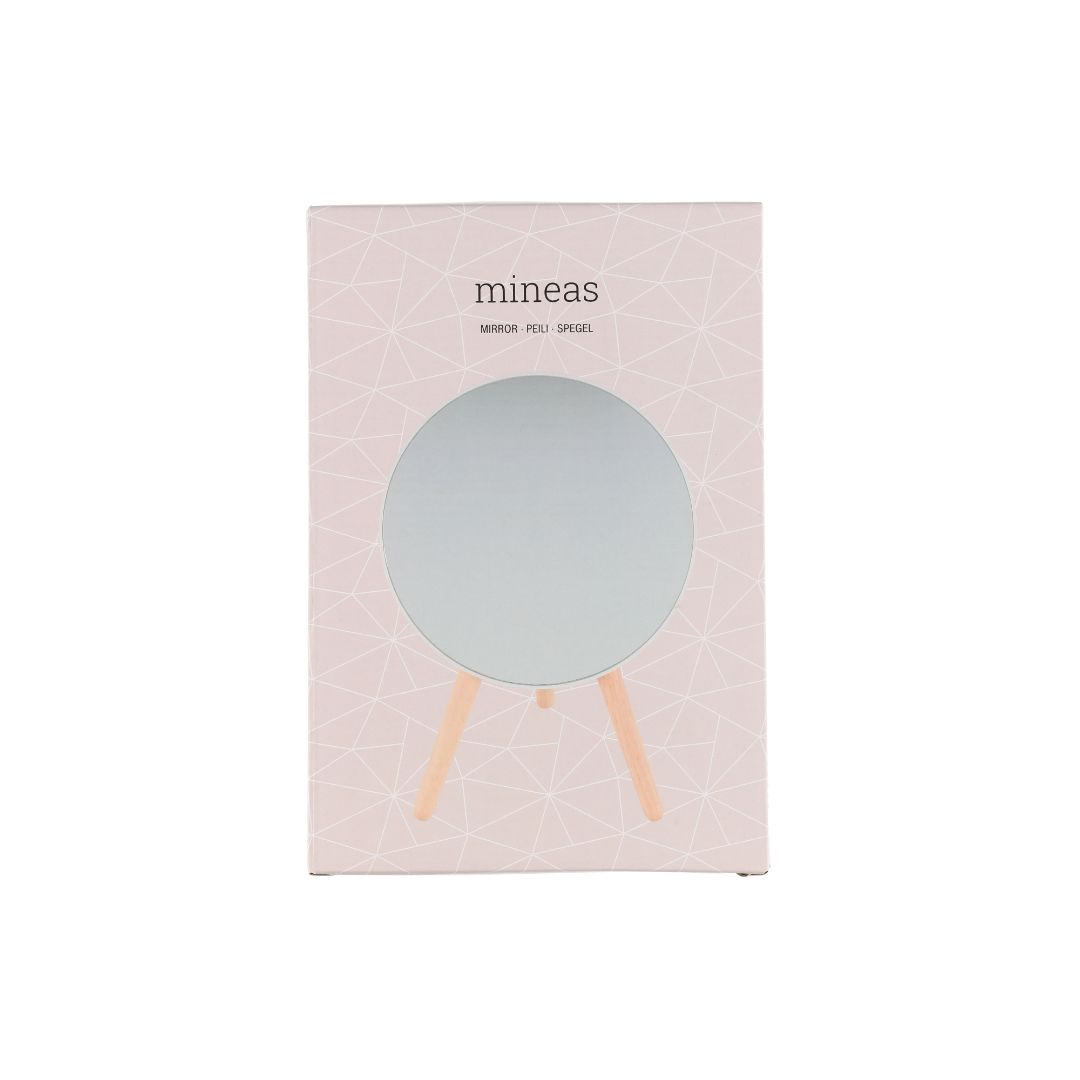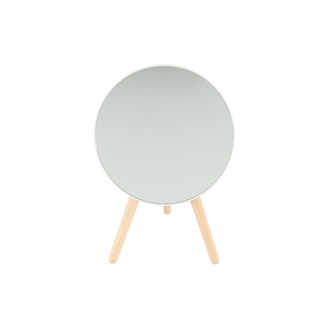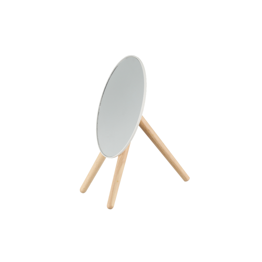 Rundt bordspeil med hvit bakside og ben i gummitre. Praktisk størrelse til baderom og sminkebord.