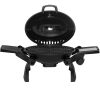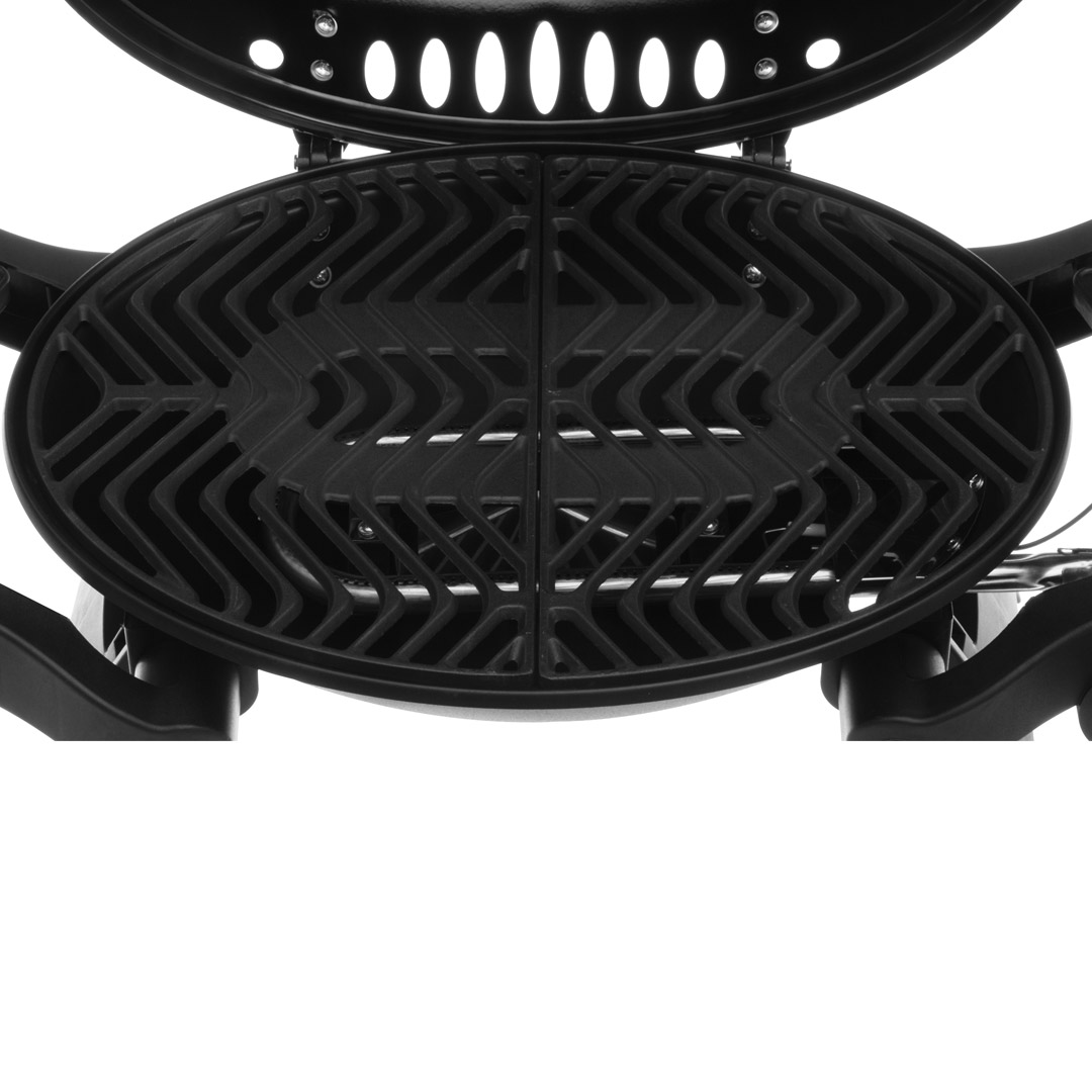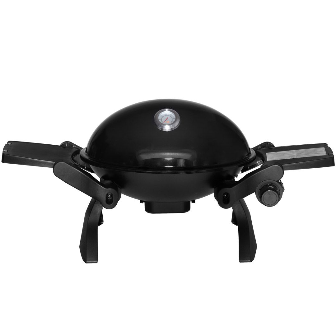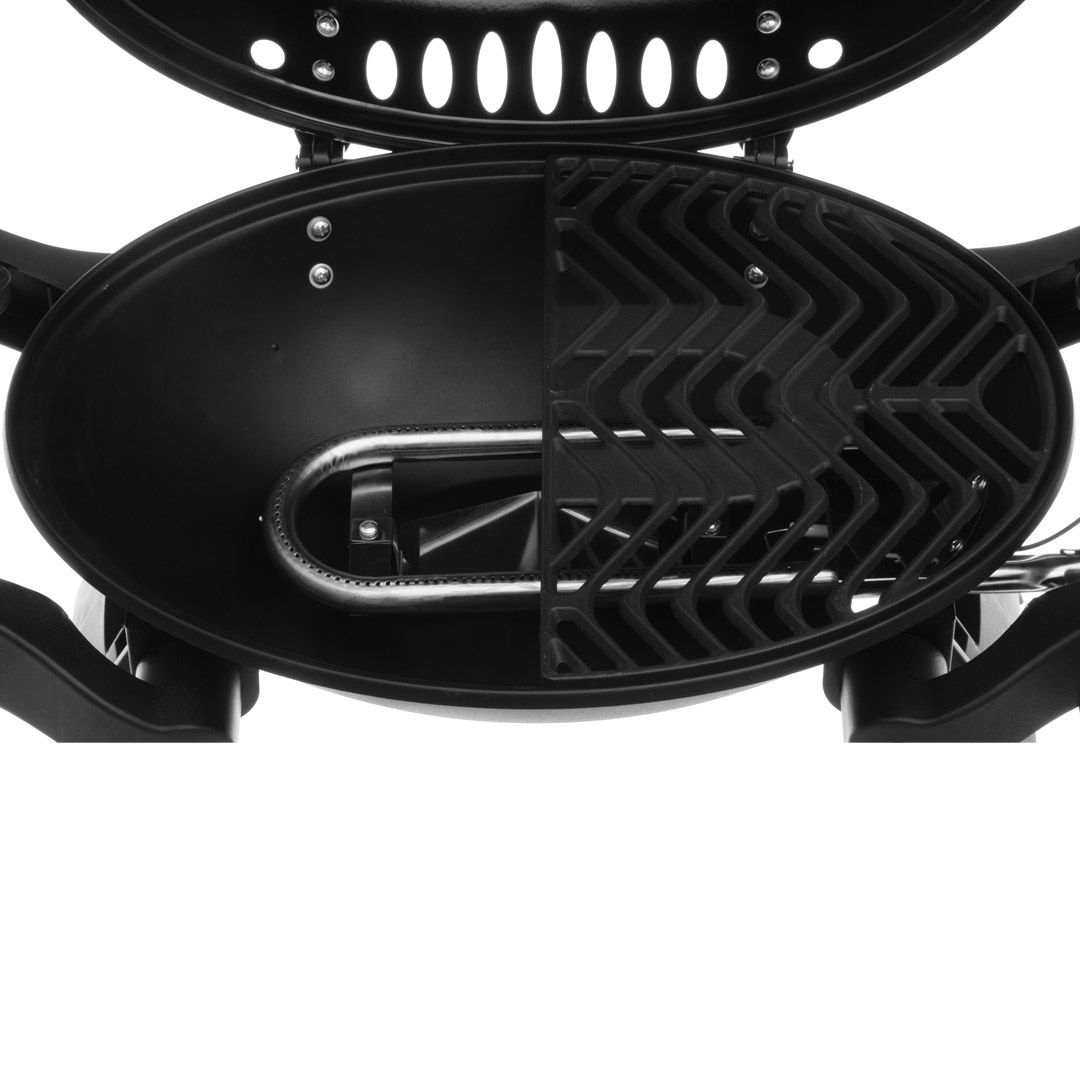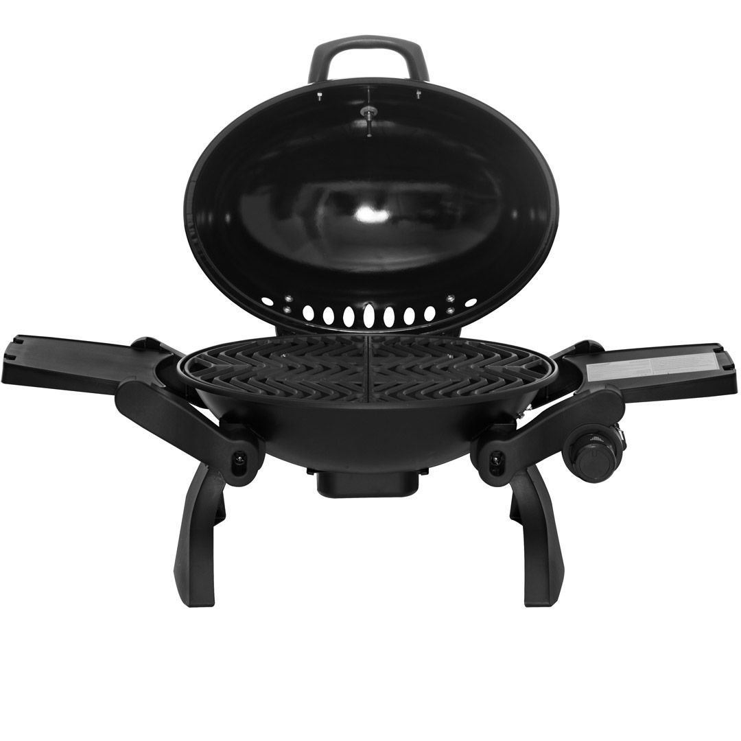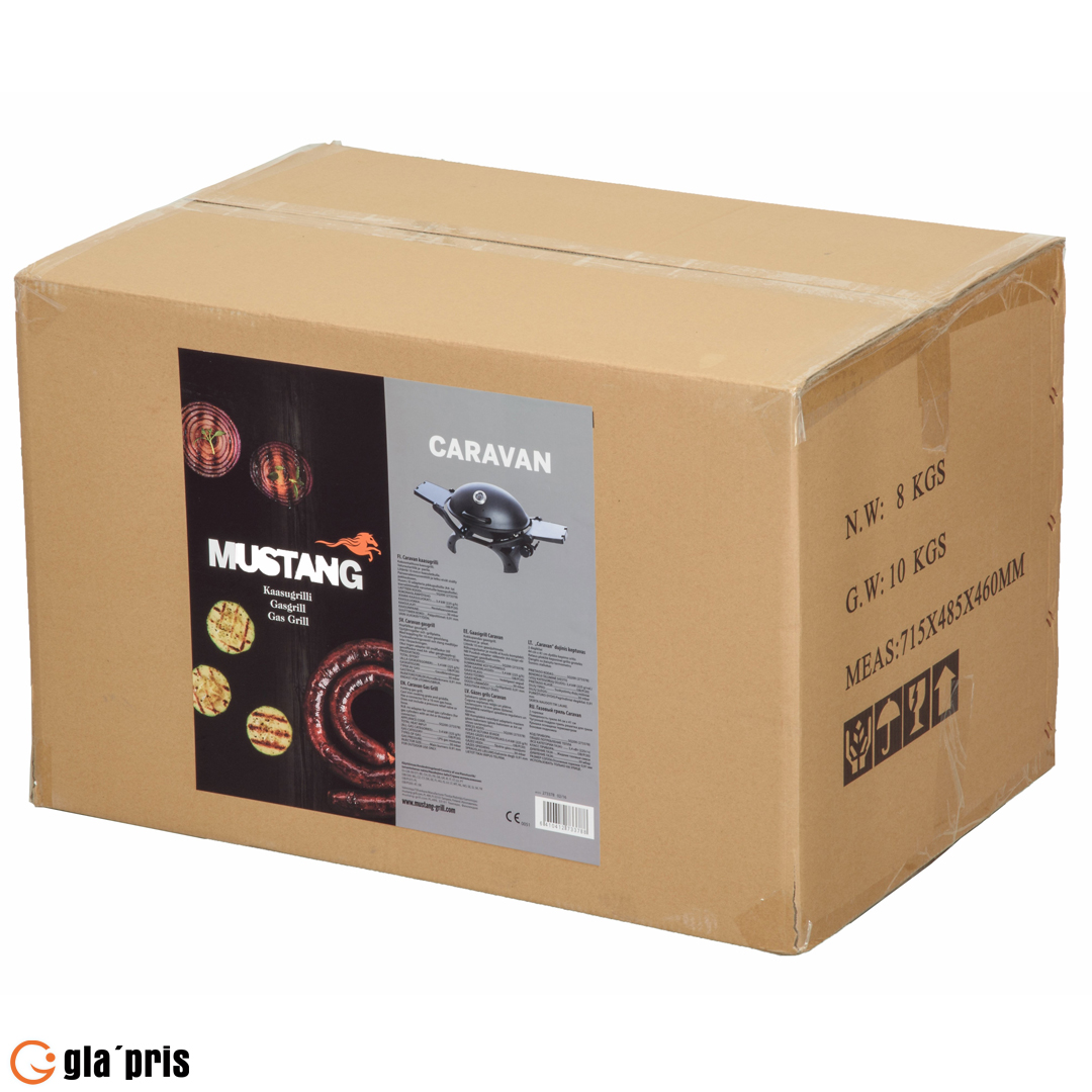 MUSTANG CARAVAN.Oval formet bærbar gassgrill. Kokeplass ca. 48 x 35 cm. 1 stk rustfri brenner på 3,4 kW. Gassforbruk 225 g/t. Flammetemmere 2 stk. Høytemperaturbestandig malt grilllokk i matt sort. Håndtak med varmebestandig plast. Sammenleggbare sidebord i plast. Svart belagt drypppanne (stål). Støpejernsgitter. Piezo-tenning integrert til kontrollknapp. Med kobling for 10 mm slange. Regulator og slange er ikke inkludert. Ingen adapter for små flasker (A4 eller gjenget kobling). Dysestørrelse 0,86 mm. Mustang caravan gassgrill er lett å bære, passer perfekt for eksempel i en bobil eller båt. Passer også som en hendig minigrill for de som bare griller litt om gangen.