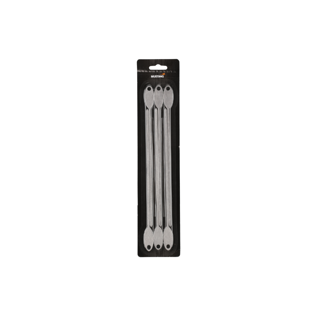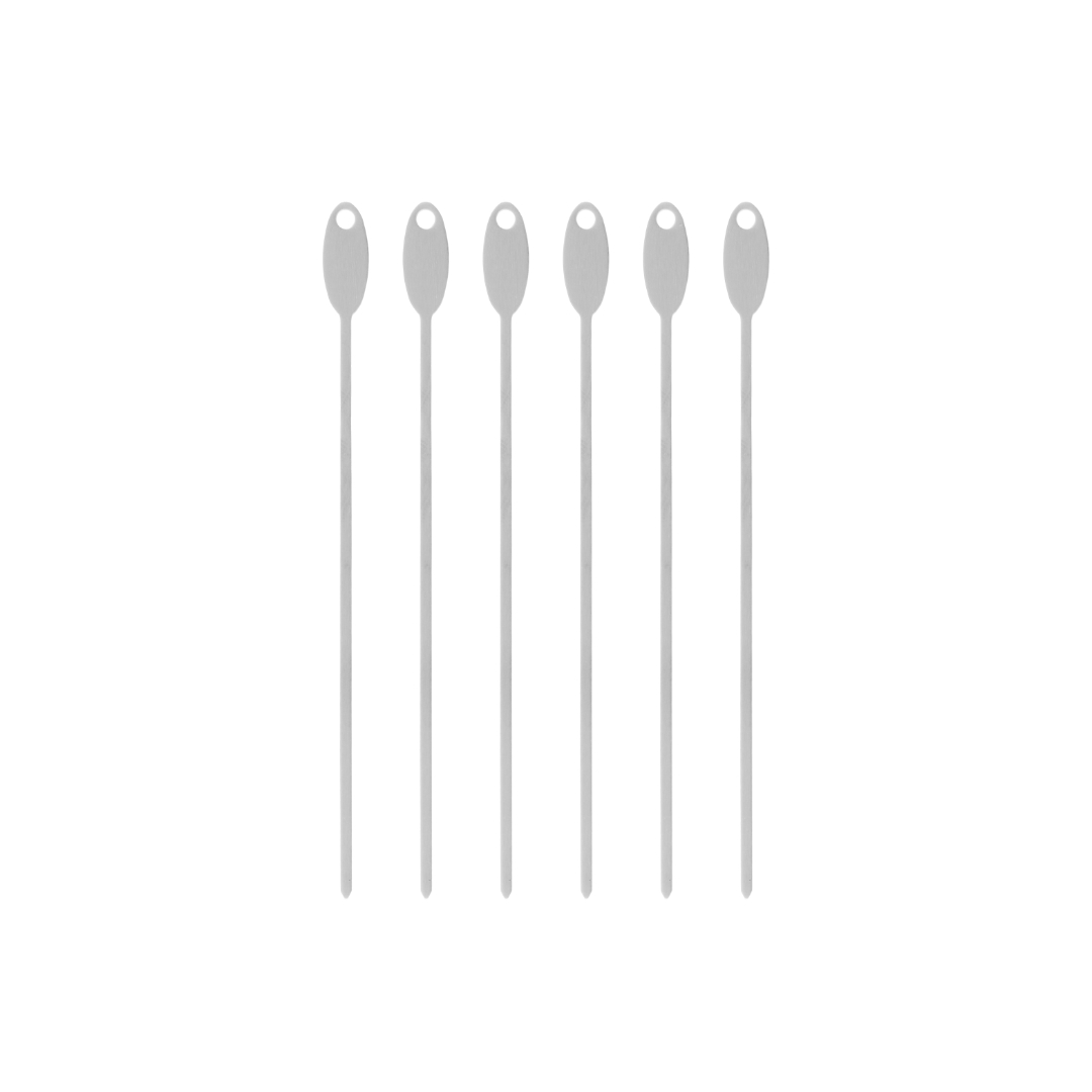 Sett med seks grillspyd i rustfritt stål. Den flate formen hindrer maten i å rotere under grilling. Passer til kjøtt, fisk og grønnsaker.