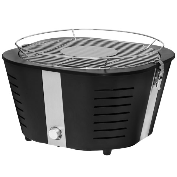 Kullgrill med innebygget vifte som blåser luft direkte på kullet. kulletbren ner da mye hardere, renere og mer effektivt. Viften kan trinnløstreguleres på egen bryter. Grillen blir ikke varm på utsiden siden denhar doble vegger. Brenner så rent at kullet omtrent ikke ryker i dethele tatt. Størrelse: 39 x 38,2 x 23,6 cm Vekt ca 4,4 Kg.