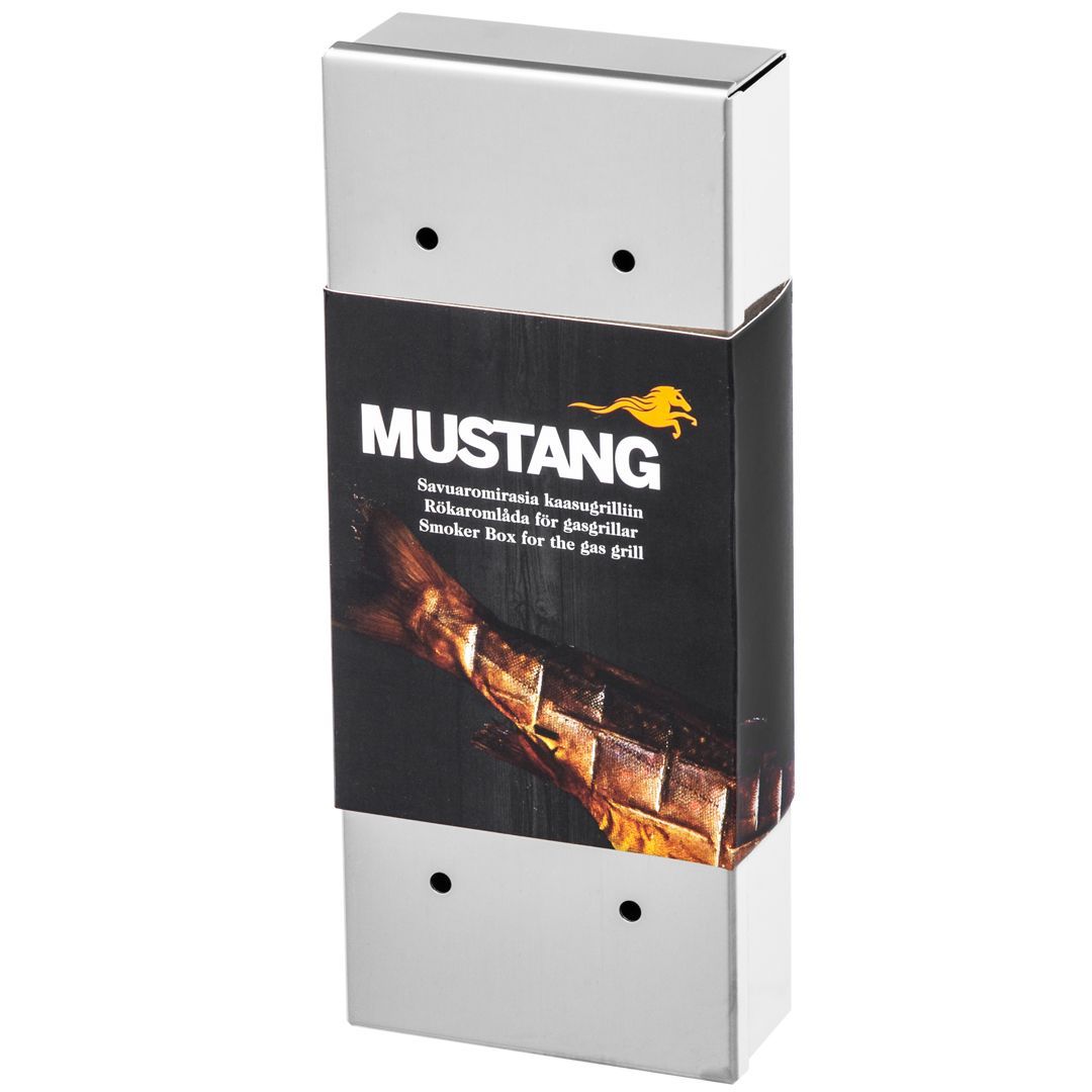 Mustang røyboks for gassgrill. Størrelse: 22,5 x 19 x 4 cm. Fyll boksenmed røykflis og plasser direkte på brenneren. Setter en veldig god smakpå maten. Håndvask med mildt såpevann.
