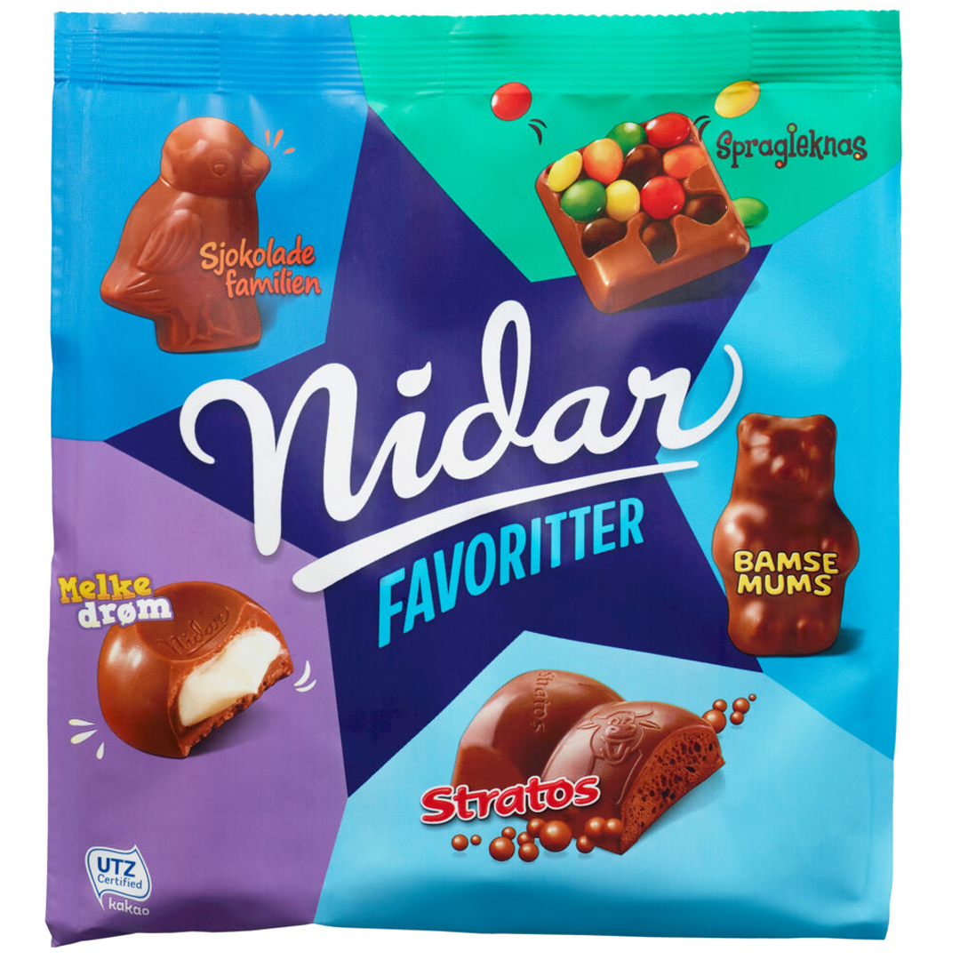 Herlig pose med Nidar sine favoritter. Består av Stratos, bamsemums, melkedrøm, bringebærgele og sjokodyr. Passer utmerket til sosiale tilstelninger, og er en favoritt blant barna.
