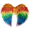 Vinger med juksefjær i regnbuefarger. Mål utslåtte vinger: H=48 cm. B=60 cm. Materiale: Polyester.