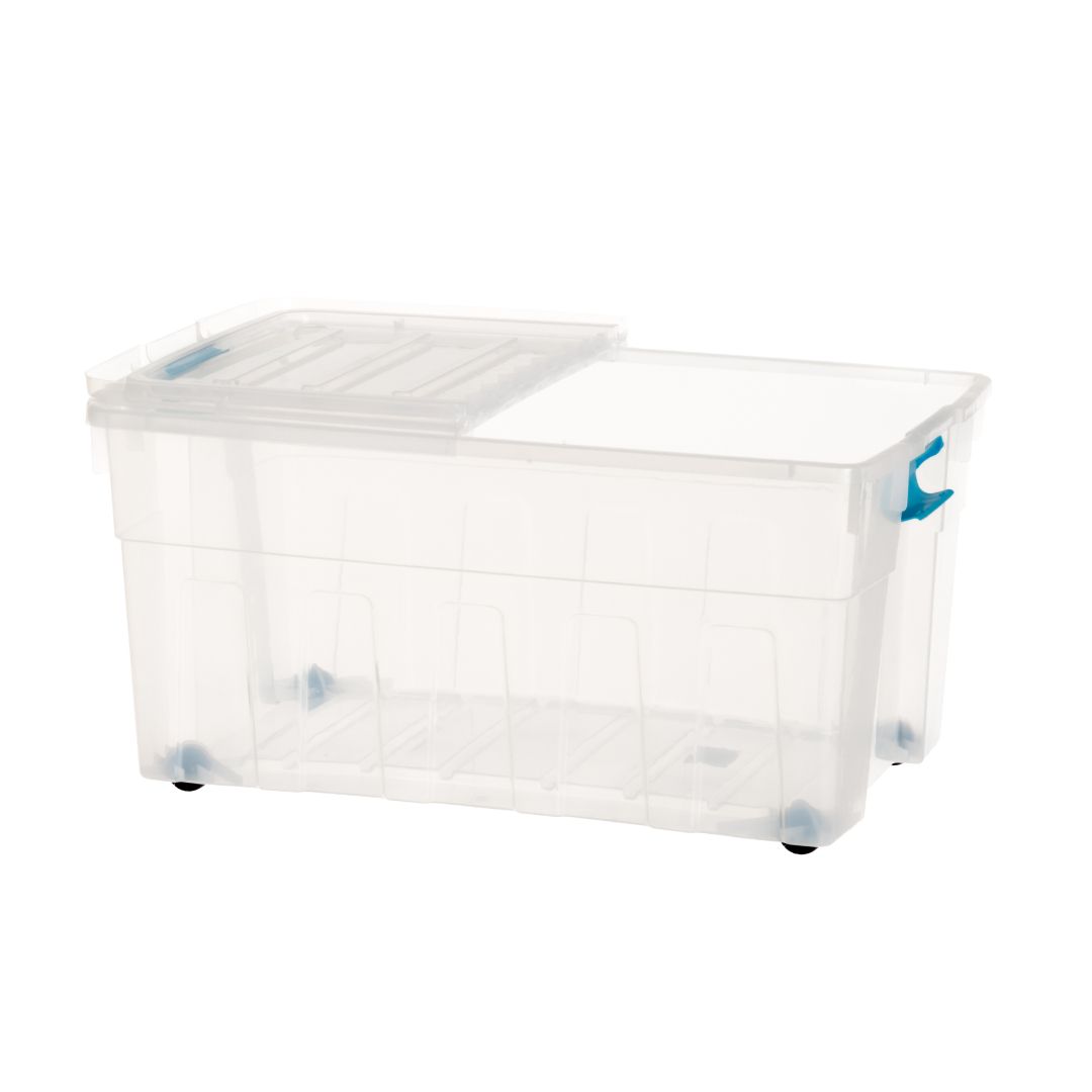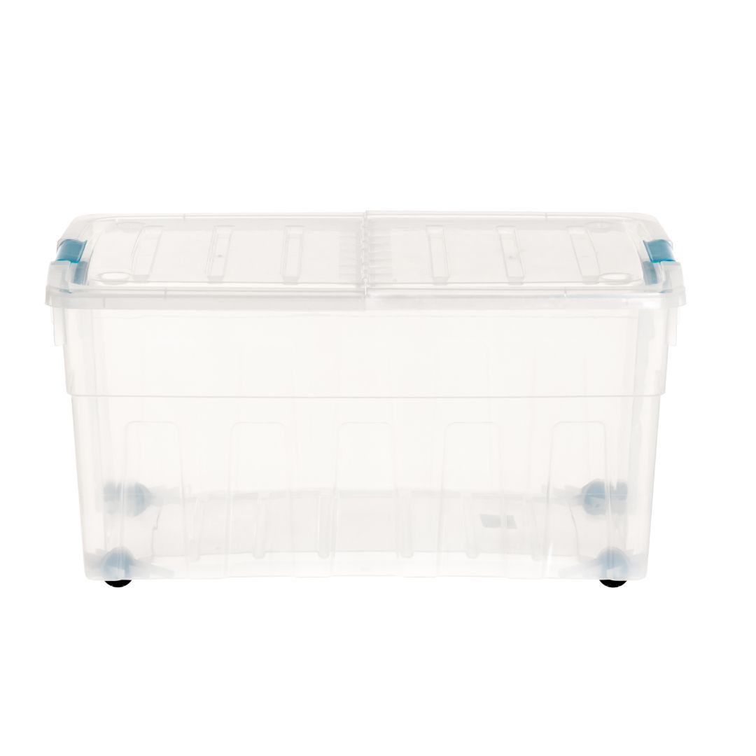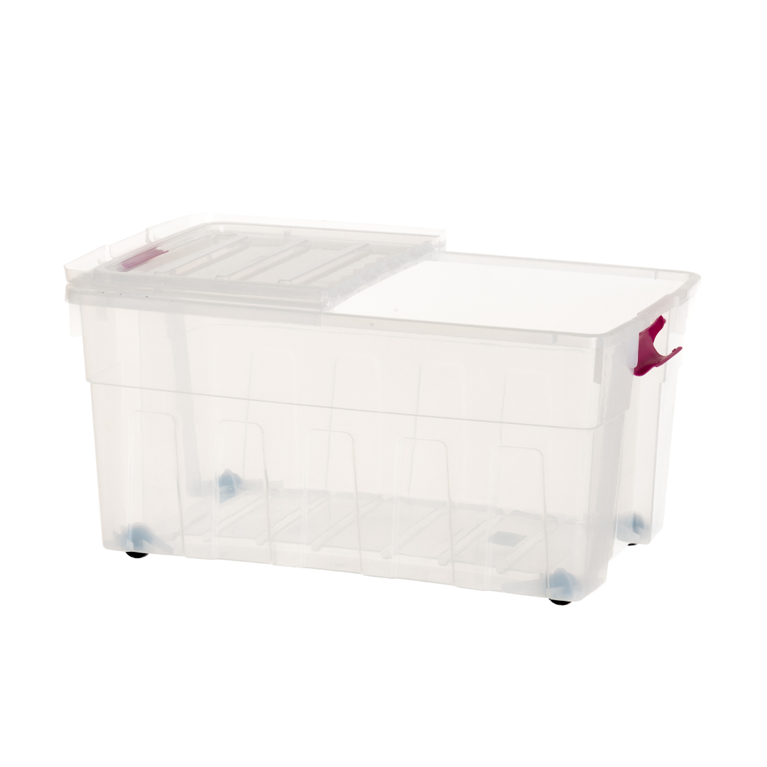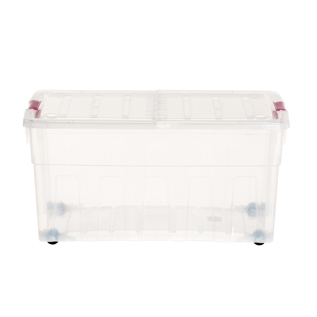 Romslig oppbevaringsboks fra Nord Clean med hele 120 liters kapasitet. Laget av solid transparent plast med hjul og hengslet lokk for enkel håndtering. Fargede håndtak i blått eller rosa gir et praktisk og dekorativt preg. Ideell til oppbevaring av større gjenstander som sesongklær, dyner eller leker.