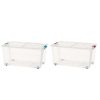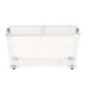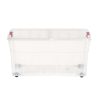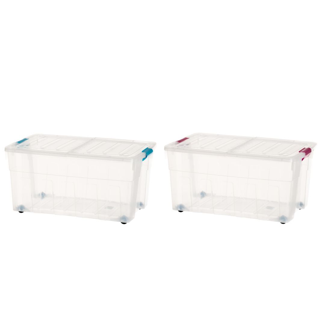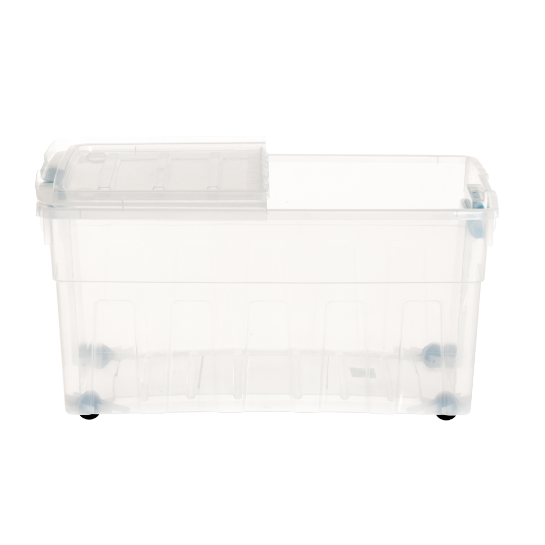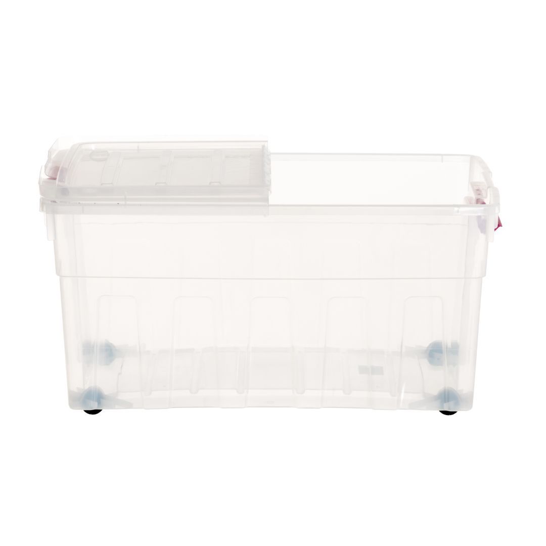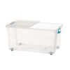 Romslig oppbevaringsboks fra Nord Clean med hele 120 liters kapasitet. Laget av solid transparent plast med hjul og hengslet lokk for enkel håndtering. Fargede håndtak i blått eller rosa gir et praktisk og dekorativt preg. Ideell til oppbevaring av større gjenstander som sesongklær, dyner eller leker.