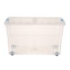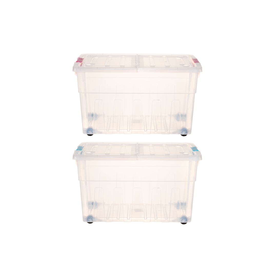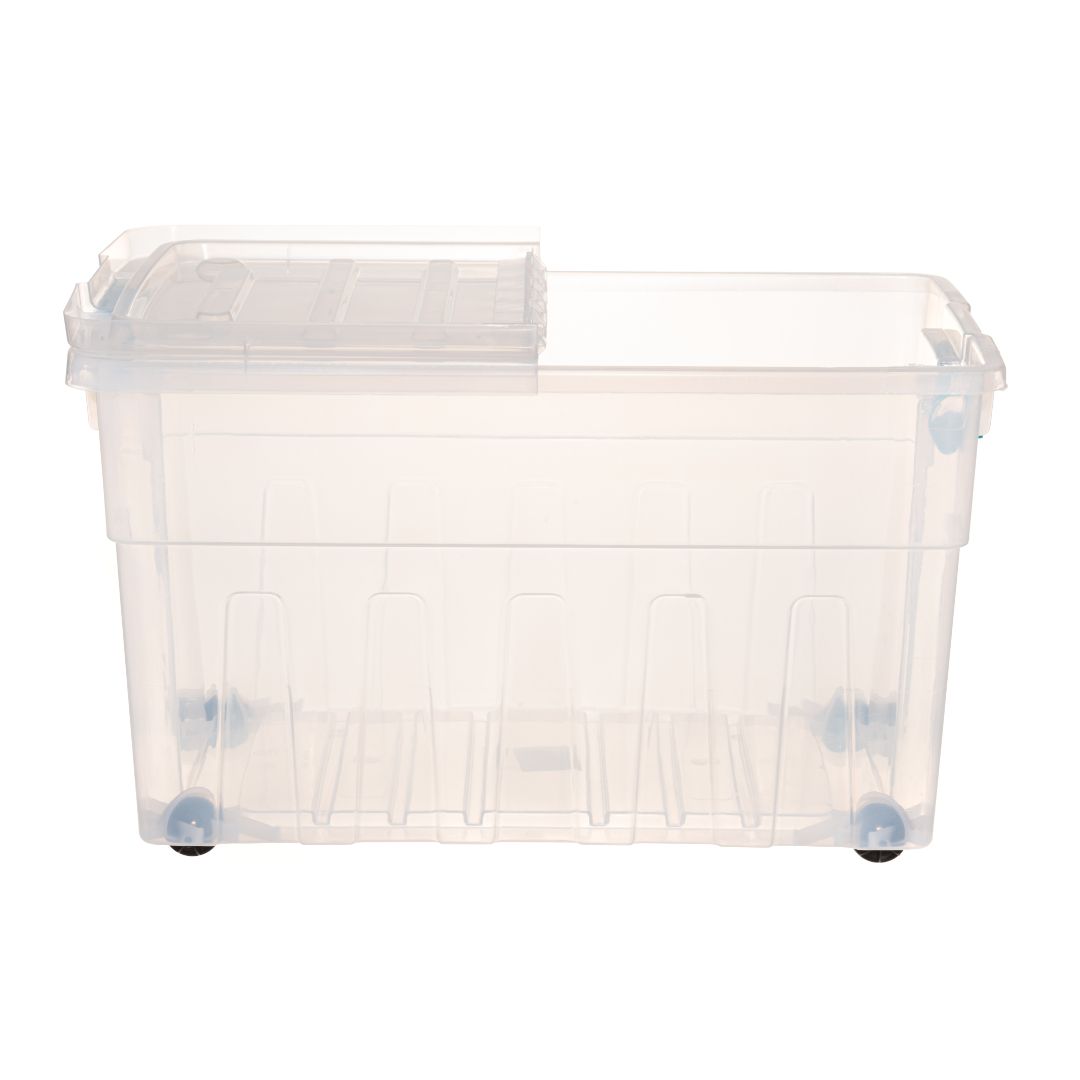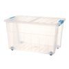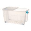 Stor og praktisk oppbevaringsboks fra Nord Clean med kapasitet på 65 liter. Boksen er laget i transparent plast og har hjul som gjør den enkel å flytte. Lokket har hengsler og fargede håndtak i blått eller rosa. Perfekt til oppbevaring av klær, leker eller rengjøringsartikler – robust og enkel å stable.