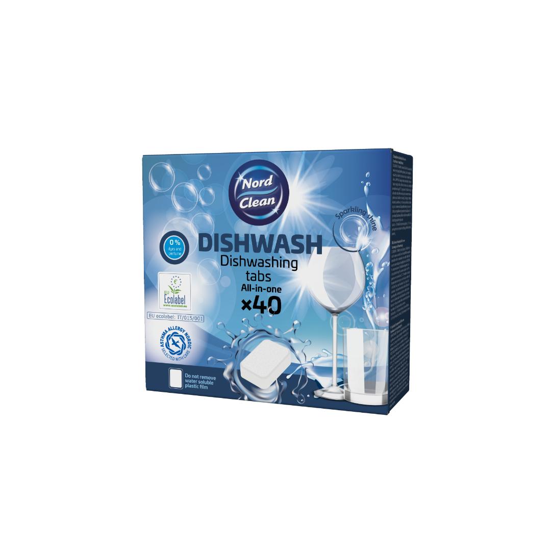 Nord Clean oppvaskmaskintabletter All in One 40 stk er hurtigoppløsende tabletter som gir en effektiv oppvask i maskin. Den vannløselige filmen skal ikke fjernes, men løses opp under vask. Tablettene er uten parfyme og fargestoffer, og er sertifisert med EU Ecolabel samt Asthma Allergy Nordic.