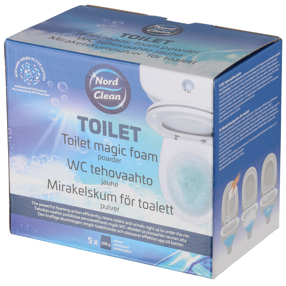 Nord Clean toalettskumpulver renser effektivt toaletter og urinaler helt til opp under kanten. Påføring: skyll toalettskålen før behandling. Vent noen minutter. Hell 1 pose wc-pulver (100 gr) i bollen. Dette skaper et skum, som stiger til kanten. Skyll når skummet faller sammen. Lukk pulverbeholderen etter bruk og oppbevar på et tørt sted. Følgende kan påvirke effektiviteten til WC-pulveret: formen på bollen og mengden vann i bollen, de kjemiske parametrene til vannet, lagringsforholdene til produkt. En frisk duft av sitron. Natriumbikarbonat, sitronsyre, sulfaminsyre, natriumkarbonatperoksid, natriumdodecylbenzensulfonat, natriumcitrat, Ceteareth-25, TAED, parfyme, silika