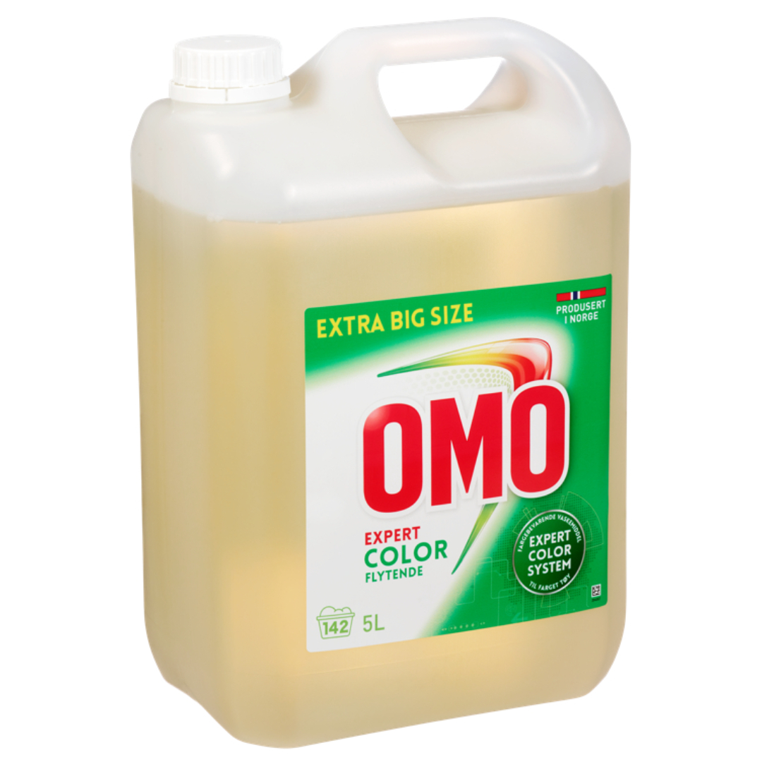 Ekstra stor pakke 1,5 l Omo vaskemiddel for farget tøy. Flytende vaskemiddel som fjerner flekker effektivt fordi den løses raskt opp i vann og klesvask.