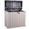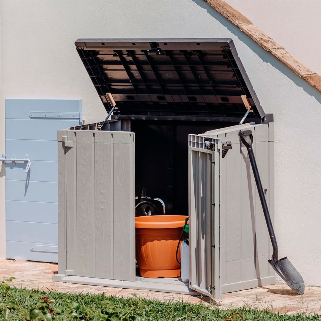Kraftig oppbevaringsboks i plast med 2 dører og lokk. Kraftige gassdempere på lokk.