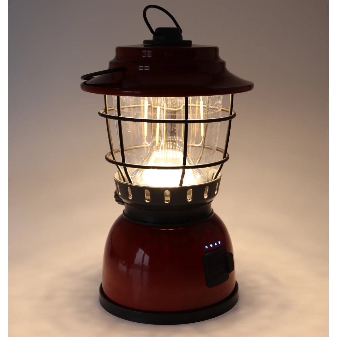 Robust og lyssterk campinglykt med klassisk utseende og moderne LED teknikk Lykten har både varmhvit LED filament som er meget dekorativt og kaldhvit LED med kraftig, hvitt lys. Begge kan dimmes trinnløst slik at man oppnår ønsket lysstyrke, opp til maks 500lm. Ladeport: USB C (USB-USB C kabel medfølger) Lampen er sprut- og støtsikker, med solid gitter og kraftig opphengsbøyle. Batteri: 4000mAh Lithium. Brukstid pr oppladning: Fra 2,5-216t avhengig av lysstyrke og modusOppladingstid 4 – 5t Campinglykten har også USB 5v1A utgang for lading av mobiltelefon etc. Vekt: 915 gr Dim: 237x146mmFinnes i to fargekombinasjoner: 600485 Rød/Svart600486 Matt Svart