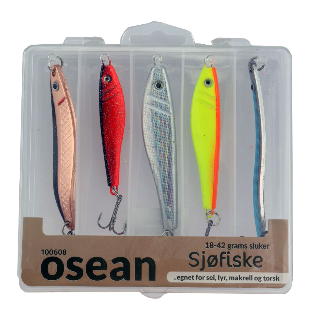 Osean sluksett for kystfiske er et komplett sett med fem fiskesluker til allsidig sjøfiske. Settet dekker vektområdet 18–42 gram og er utviklet spesielt for norske forhold. Slukene har balansert gange og realistiske farger som gjør dem effektive på arter som torsk, sei, lyr og makrell. Perfekt for deg som vil ha et profesjonelt og pålitelig utgangspunkt for fiske fra land eller båt.
