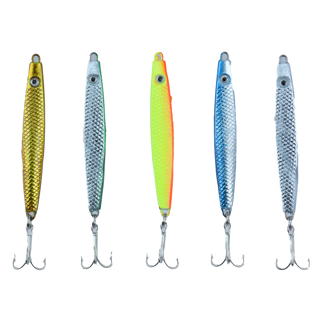 Pakke med 5 stk assorterte sluker à 18gr, passende til det meste av stangfiske til sjøs og elv. 5 ulike farger.