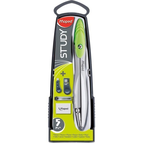 Skolepasser i plasteske med tilleggsutstyr som bly, spisser til bly, viskelær og skrutrekker